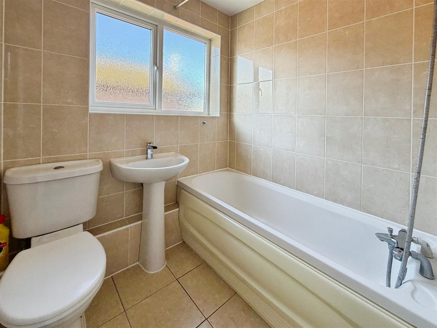 The bathroom features a bath with shower over, WC, wash hand basin and a heated towel rail and is fully tiled.