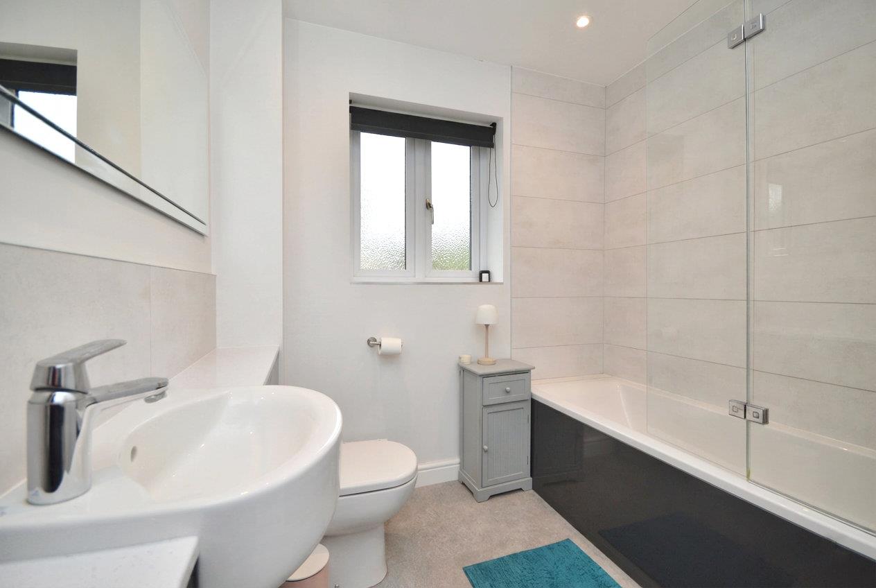 uPVC double glazed obscure window to rear aspect, fitted bath, mixer taps, shower over, wash hand basin with mixer taps, storage beneath, closed coupled WC, heated towel rail, spotlights, extractor fan,