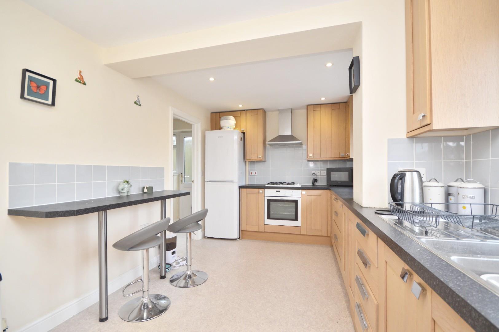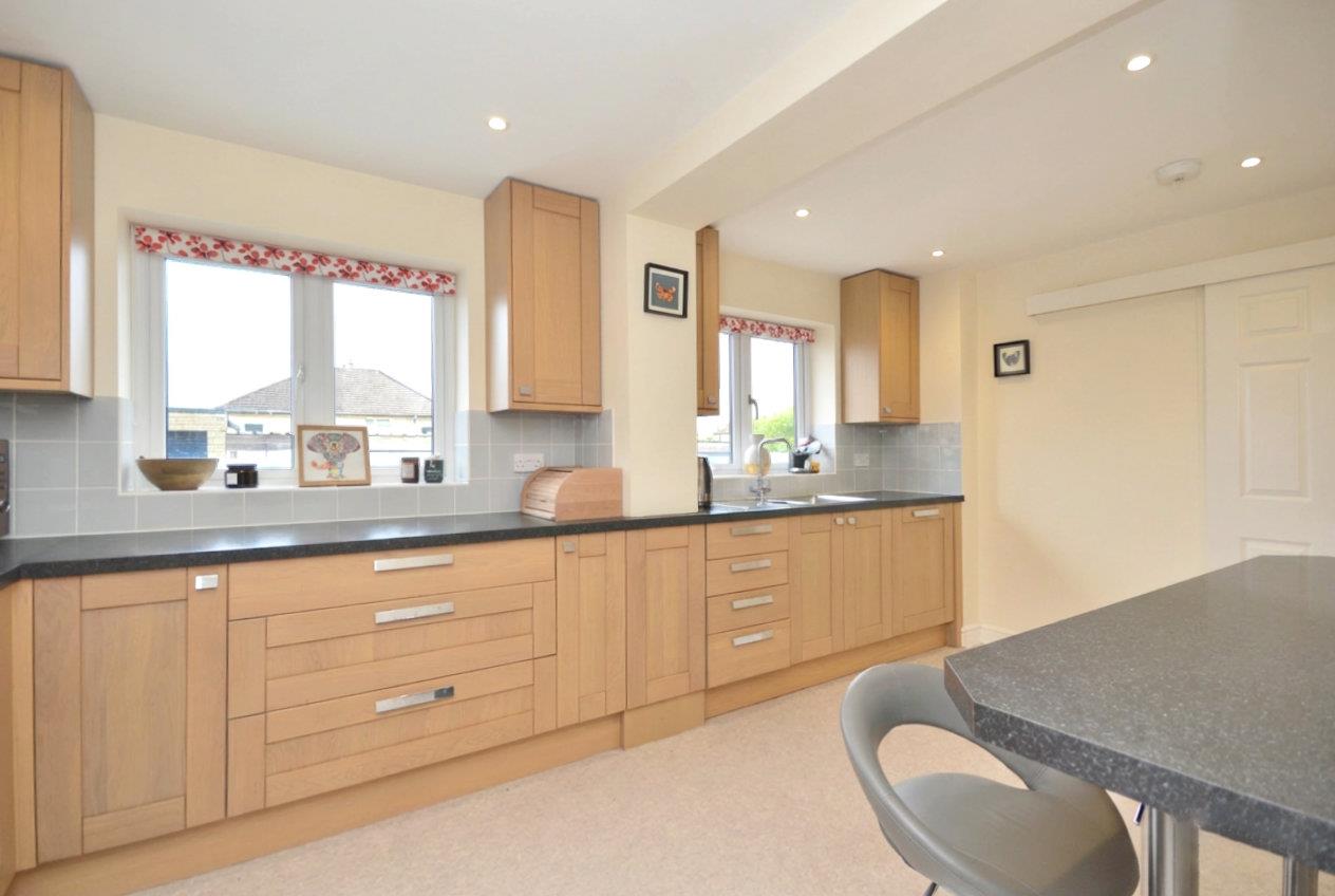 Two uPVC double glazed windows to front aspect, fitted kitchen with a range of wall and base units, work top over, breakfast bar, integrated gas hob, integrated oven, fitted extractor fan, sink with drainer, mixer taps over, integrated dishwasher, space for fridge freezer, single paneled radiator, spotlights, door leading to utility room