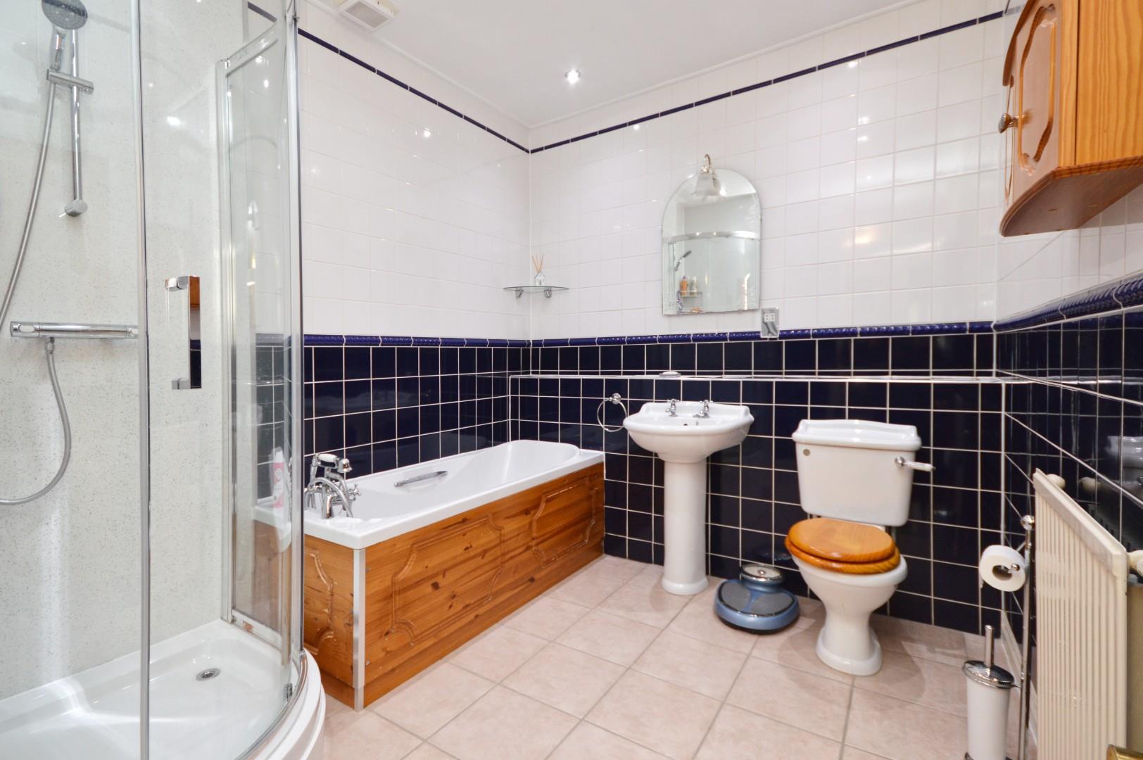 Suite comprising paneled bath, separate shower cubicle, wash hand basin with taps over, close coupled w/c, single radiator, spot lights, extractor fan.