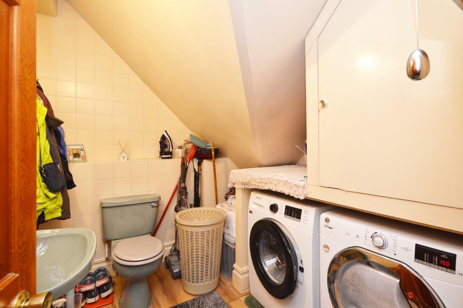 Wash hand basin with taps over, close coupled w/c, space and plumbing for washing machine, space for tumble drier, wood effect flooring, storage cupboard with fitted shelving.