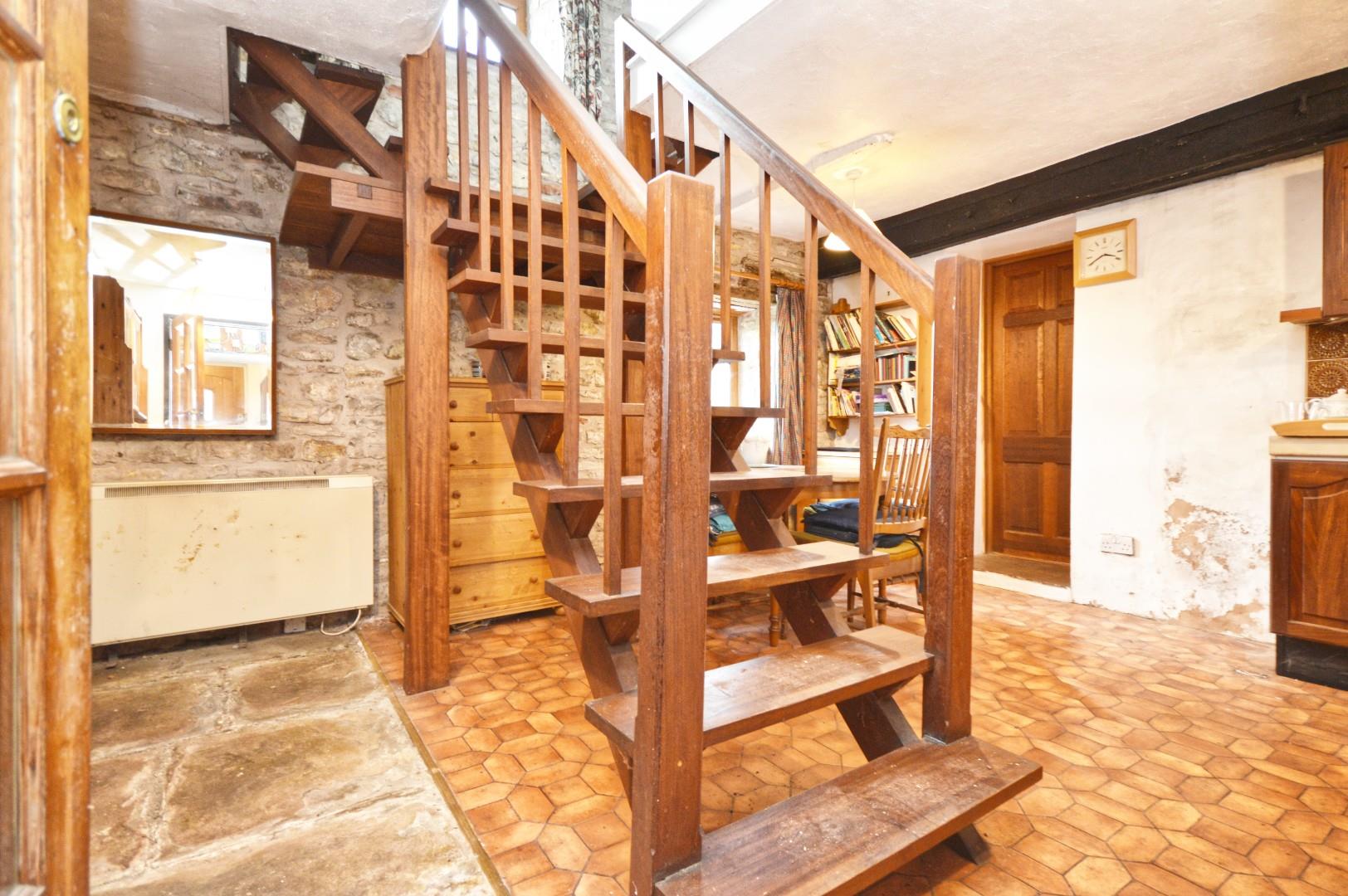 Stairs rising to split level landing, uPVC double glazed windows to front and rear aspects, a range of wall and floor units with worksurfaces over, single stainless steel sink drainer unit, tiled splash backs, space for electric cooker with extractor over, space and plumbing for slimline dishwasher, area for table, exposed stonework, part exposed flagstone flooring, exposed wooden beams, step up via wooden door into family room, double multi glazed doors to sitting room.