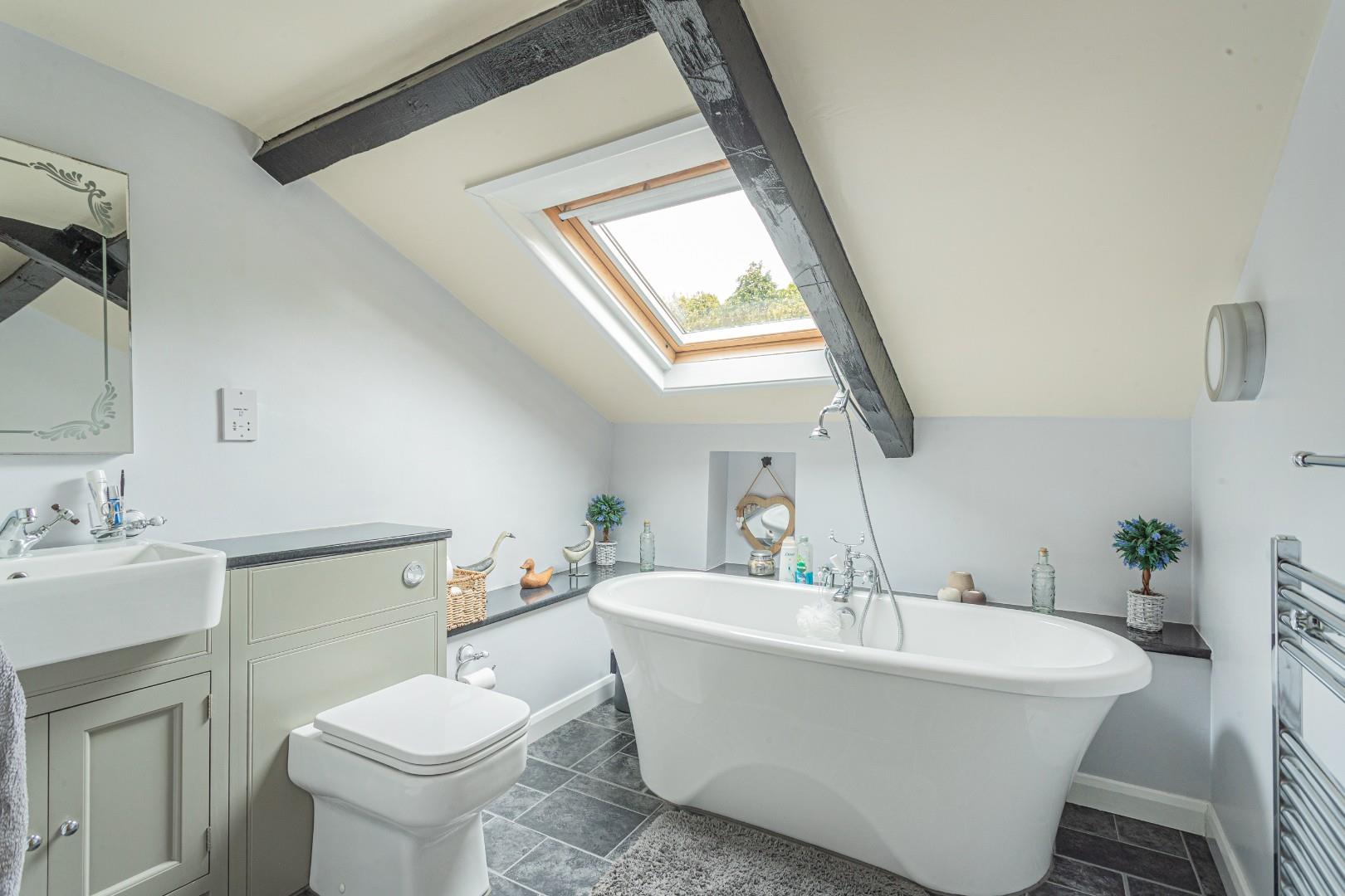 Velux window to rear aspect, suite comprising low level w/c, wash hand basin with mixer taps over and storage beneath, freestanding bath with shower attachment over, exposed wooden beams, inset spots, storage cupboard with shelving, tile effect flooring, chrome heated towel rail, door to