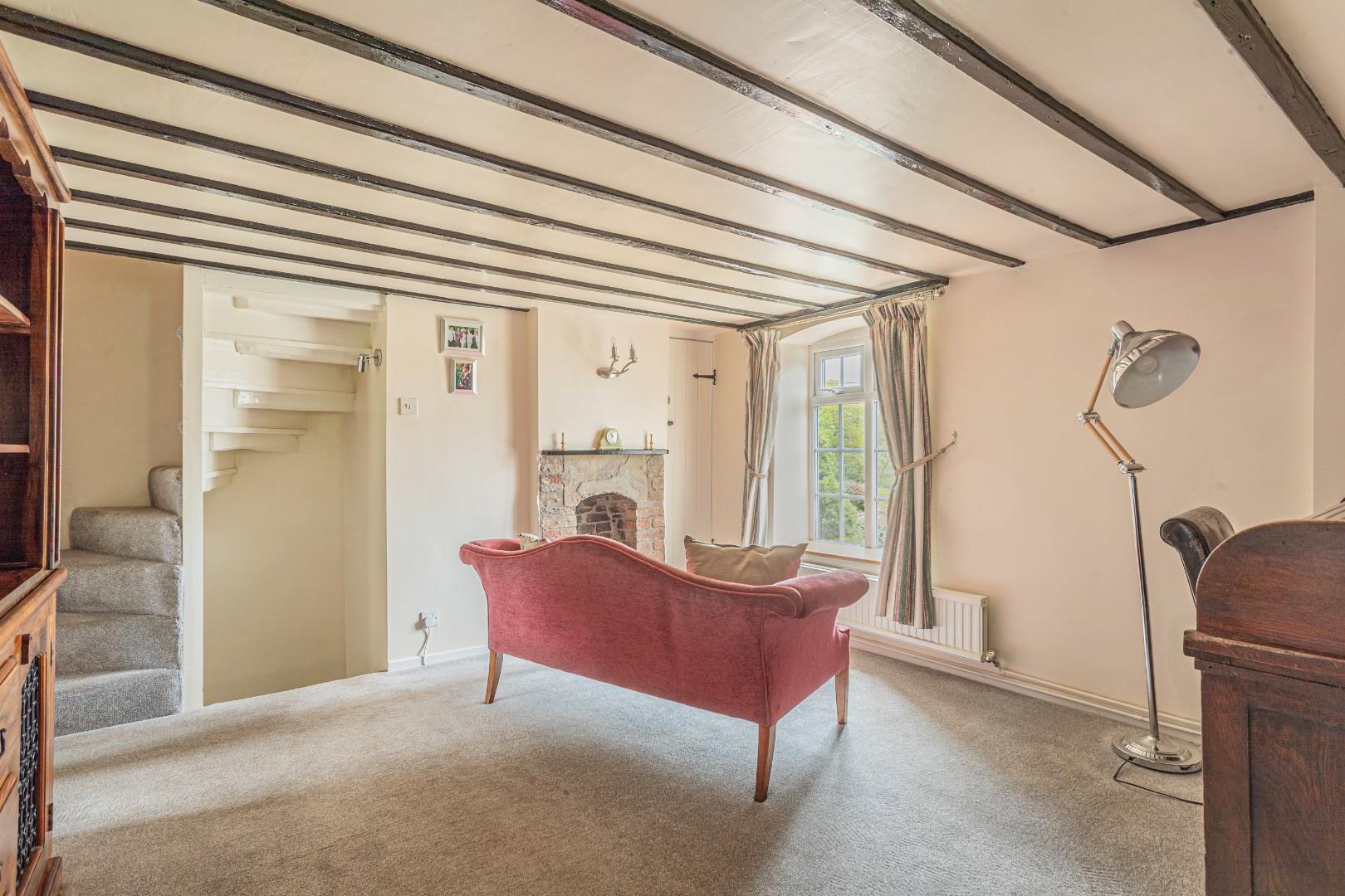 Two uPVC double glazed windows to front aspect, 2 double radiators, storage cupboard with wooden shelving, inglenook fireplace with wood burning stove and quarry tiled hearth, wooden beams.