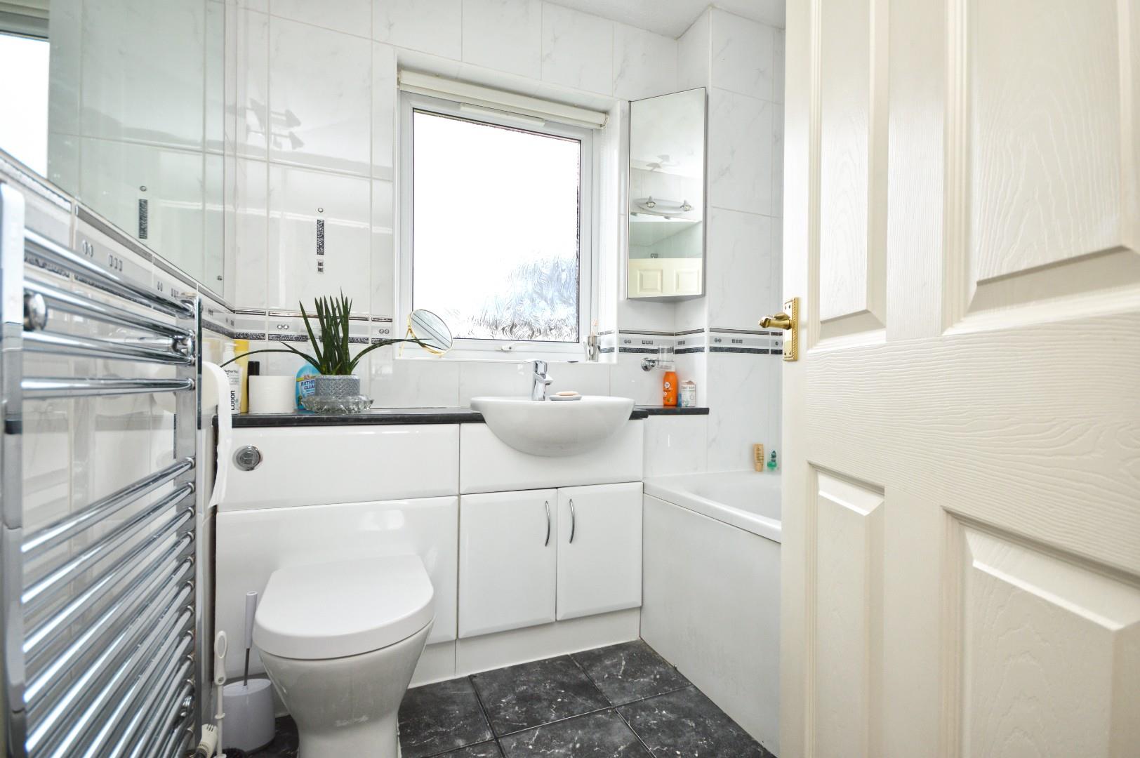 Obscured uPVC double glazed window to front aspect, paneled bath with shower attachment over, wash hand basin with mixer tap over, close coupled w/c, heated towel rail, fully tiled walls.