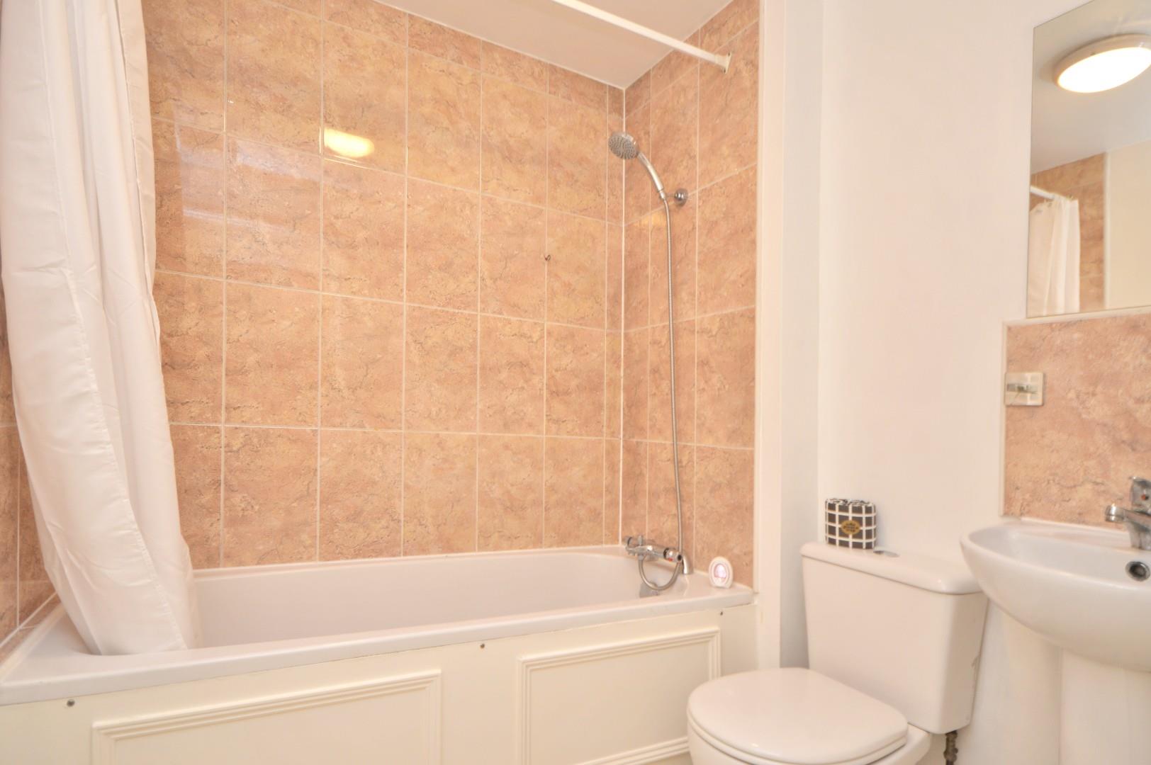 Suite comprising panelled bath with shower attachment over, close coupled w/c, pedestal wash hand basin with mixer taps, double radiator, extractor fan.