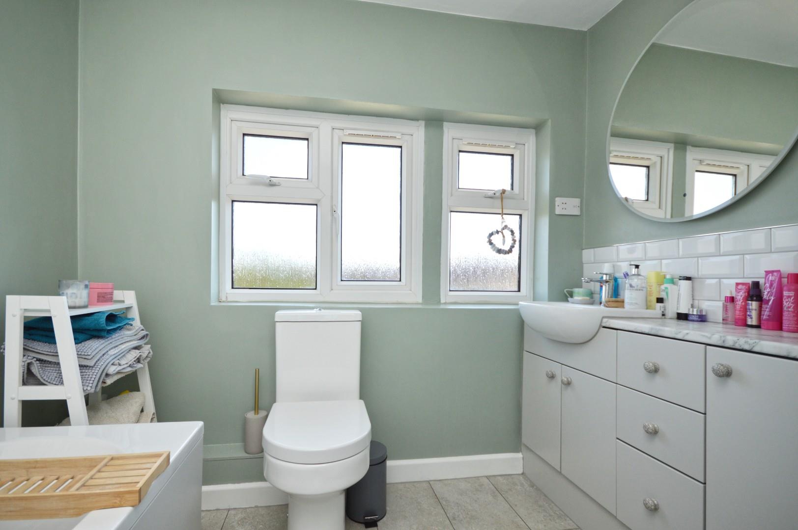 Obscured uPVC double glazed window to rear aspect, paneled bath with rainfall shower over, close coupled w/c, wash hand basin with mixer tap over and storage beneath, spot lights, extractor.