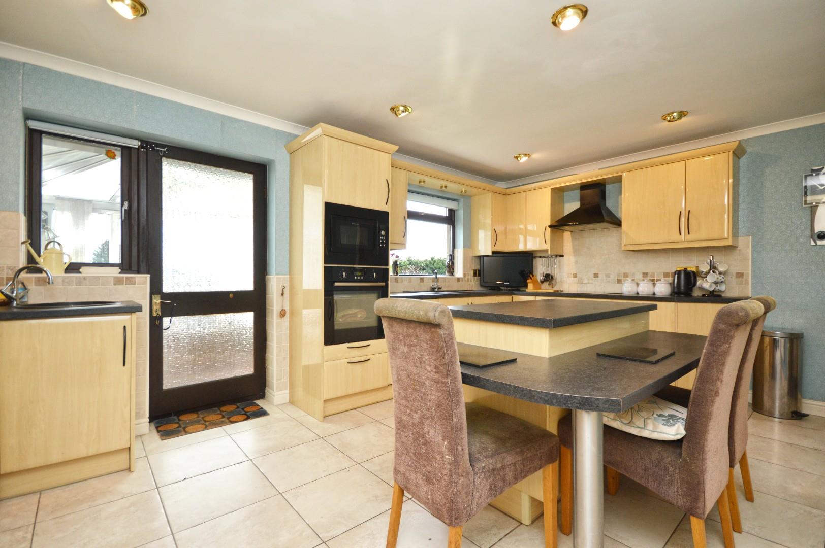 uPVC double glazed window to rear aspect, a range of wall and floor units with worksurface over, integrated induction hob with extractor over, integrated oven and microwave, space and plumbing for washing machine, space for fridge freezer, sink drainer unit with mixer taps over, additional sink with mixer tap over, island with area for bar stools, further uPVC double glazed window to rear aspect, double radiator, spot lights, door to garage, door to