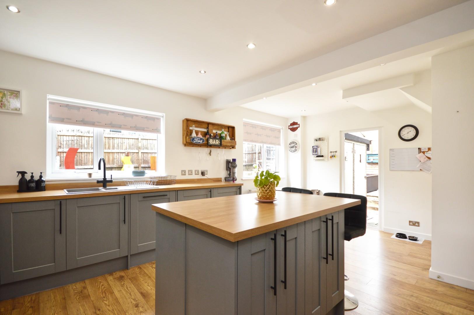 Two uPVC double glazed windows to rear aspect, a recently refitted kitchen comprising a range of wall and floor units with worksurface over, sink drainer unit with HOT TAP providing both boiling and filtered water, integrated AEG induction hob with fitted extractor over, Neff Slide & Hide oven with microwave over, integrated dishwasher, washing machine and tumble drier, space and plumbing for American style fridge freezer, under unit lighting, island with storage beneath, worksurface over, area for barstools and fitted wine cooler. Space for dining table, double radiator, uPVC obscured double glazed door to side aspect, spotlights, wood effect flooring.