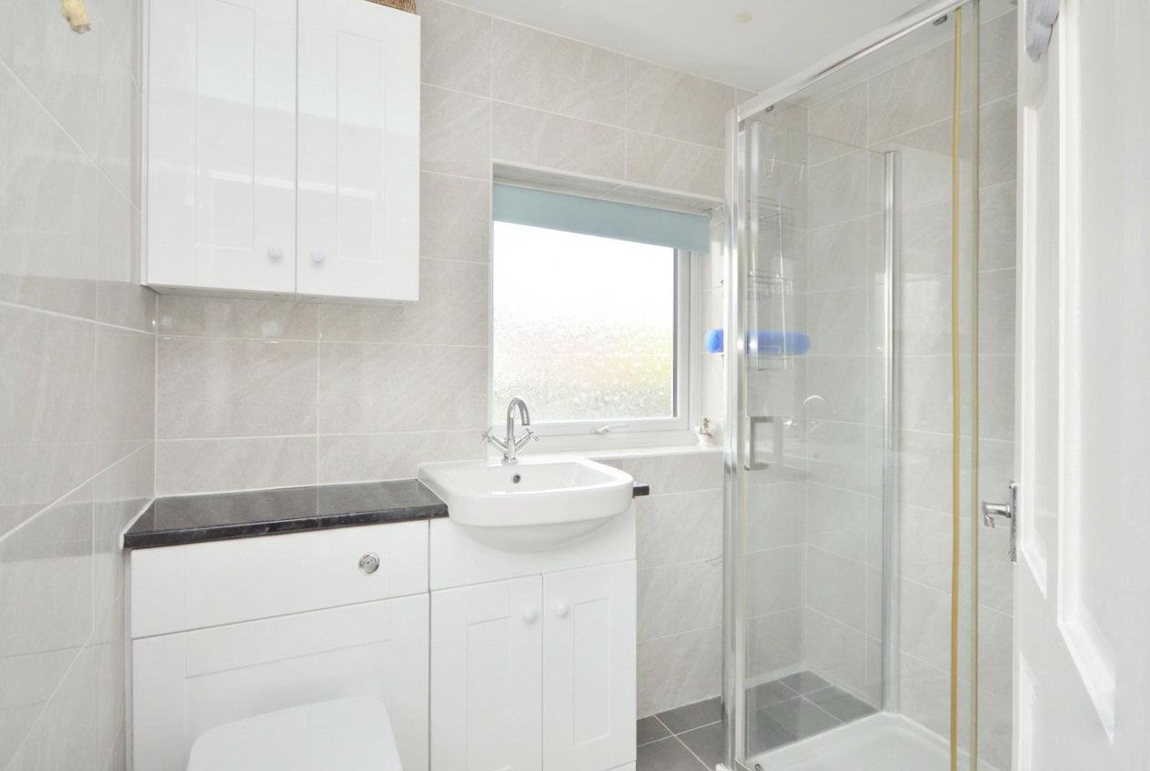 Obscured uPVC double glazed windows to side and rear aspect, suite comprising concealed cistern w/c, wash hand basin with chrome mixer taps over and storage beneath, fully tiled shower cubicle with sliding glazed door with mains rainfall shower with separate attachment over, fully tiled walls, tiled flooring, chrome heated towel rail.