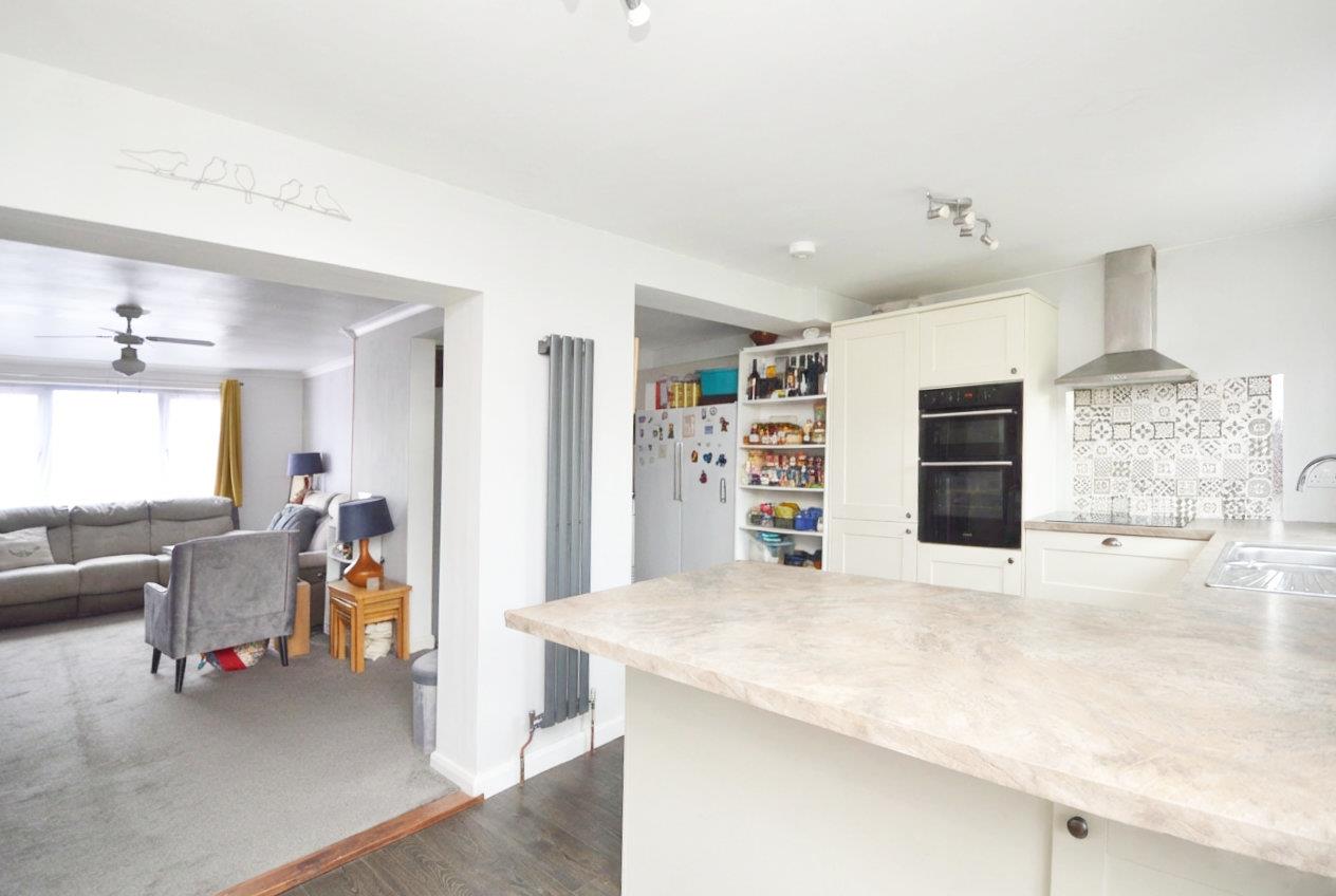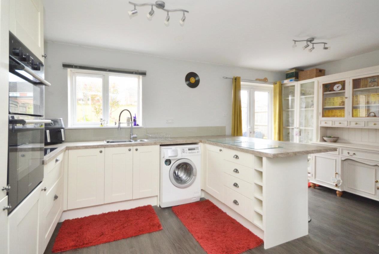uPVC double glazed window to rear aspect, uPVC double glazed French doors giving access to the rear garden, a range of wall and floor units with worksurface over, 1 1/4 bowl stainless steel sink drainer unit with mixer tap over, 4 ring Hotpoint hob with decorative tiled splash back and extractor hood with light over, space and plumbing for automatic washing machine, integrated Hotpoint oven and grill, space for white goods including fridge and freezer, space for tumble drier, space for bar stools, wood effect flooring, wall mounted contemporary radiator, single radiator.
