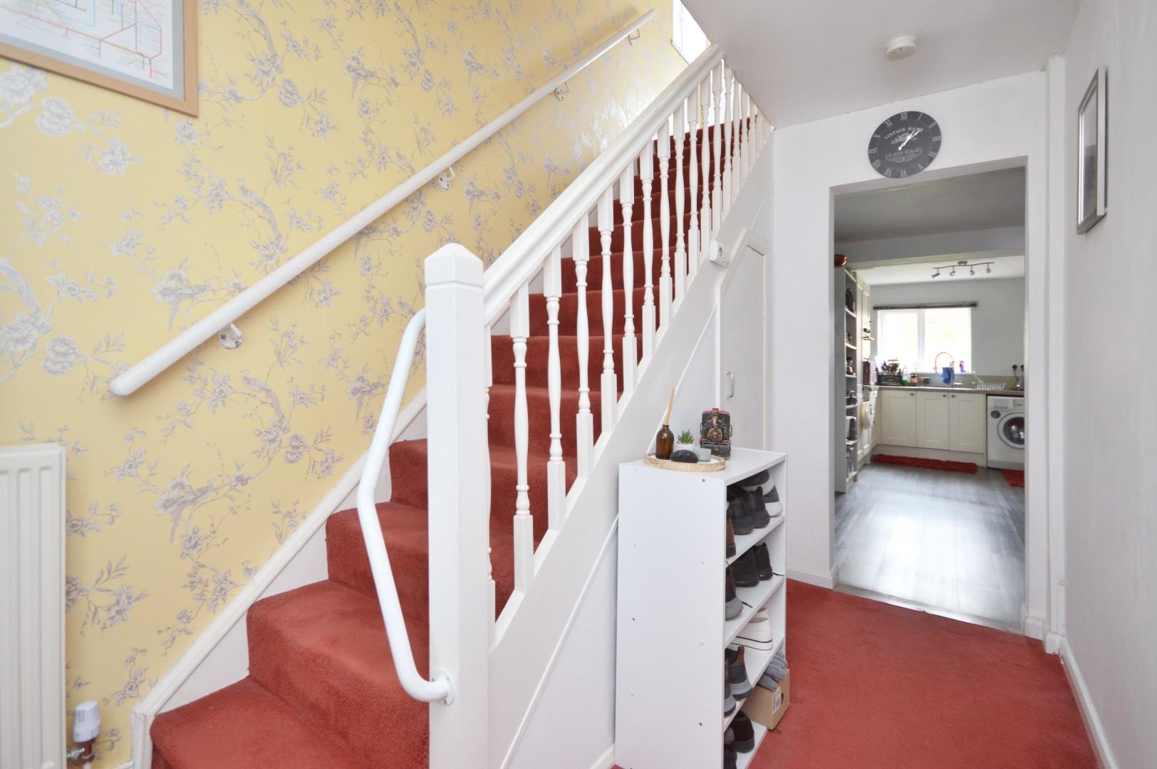 Double radiator, stairs rising to first floor landing, understairs storage cupboard, opening to