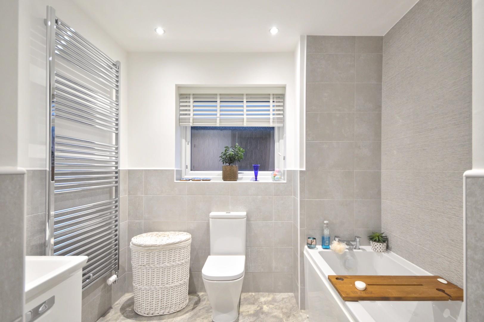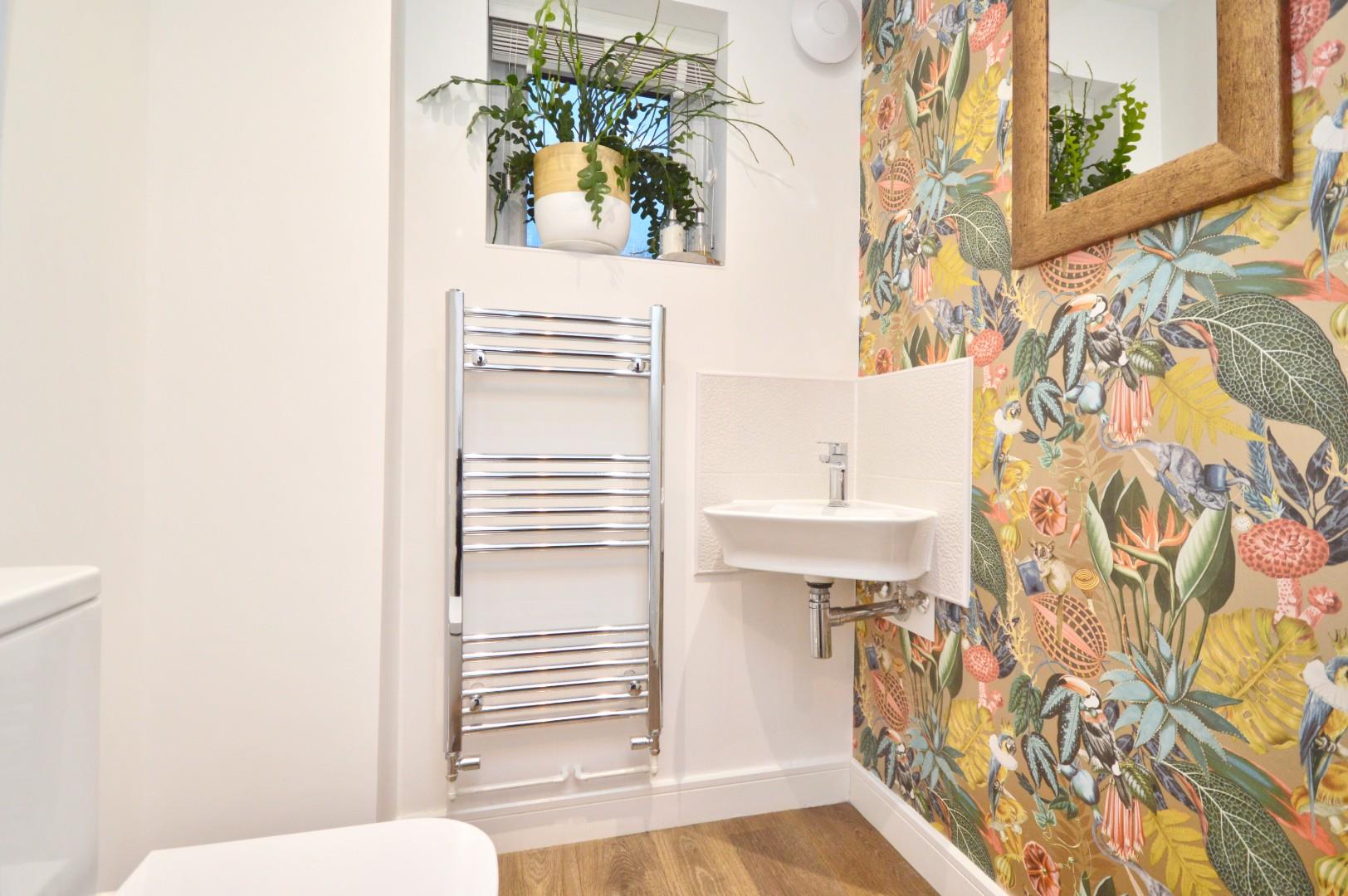uPVC obscured double glazed window to side aspect, Roca corner wash hand basin, Roca low level w/c, chrome heated towel rail, inset spots, extractor.