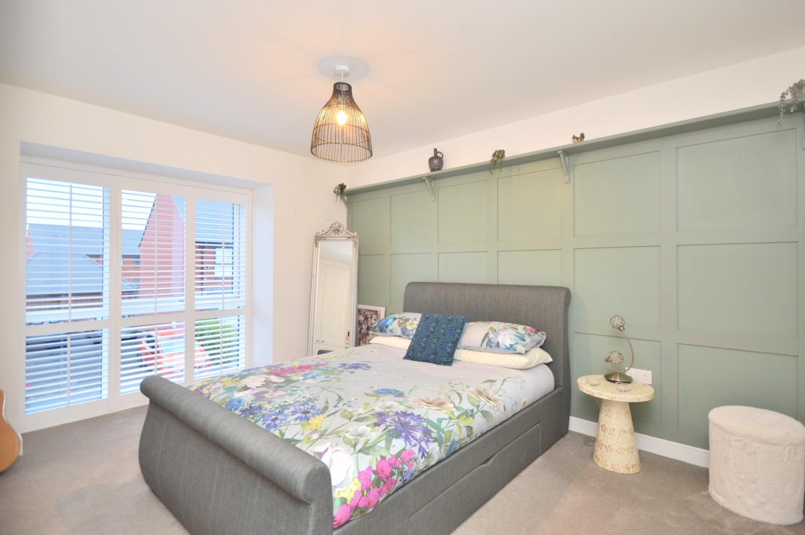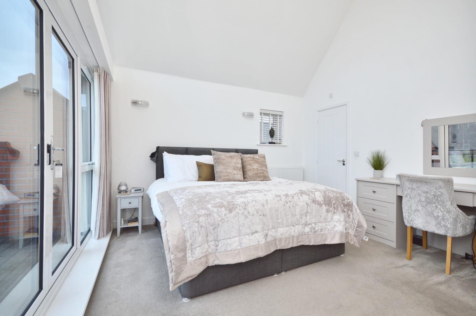 Vaulted ceiling with glazed Aluminum picture windows enjoying views over the countryside "The Hams", double Aluminum French doors to the balcony, (Please Note: French doors and window have solar reflective glass) uPVC double glazed window to side aspect, wall lights, double radiator, dressing table area, fitted wardrobes with hanging rail and shelving, electric remote control blinds, door to
