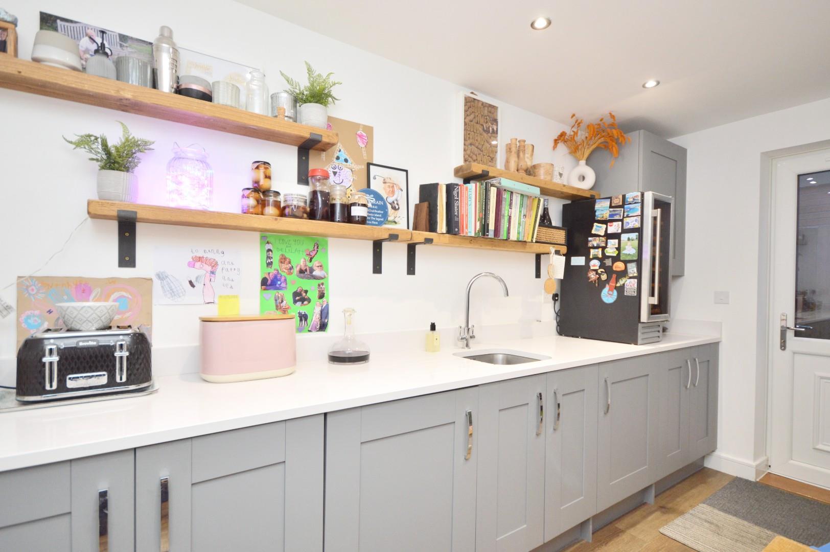 uPVC double glazed pedestrian door giving access to side aspect, single radiator, space for coats, extractor, inset spots, a further range of floor units with Quartz worksurface over, single stainless steel sink unit with chrome mixer taps over, built in appliances including AEG washing machine, cupboard housing Ideal Logic gas boiler.
