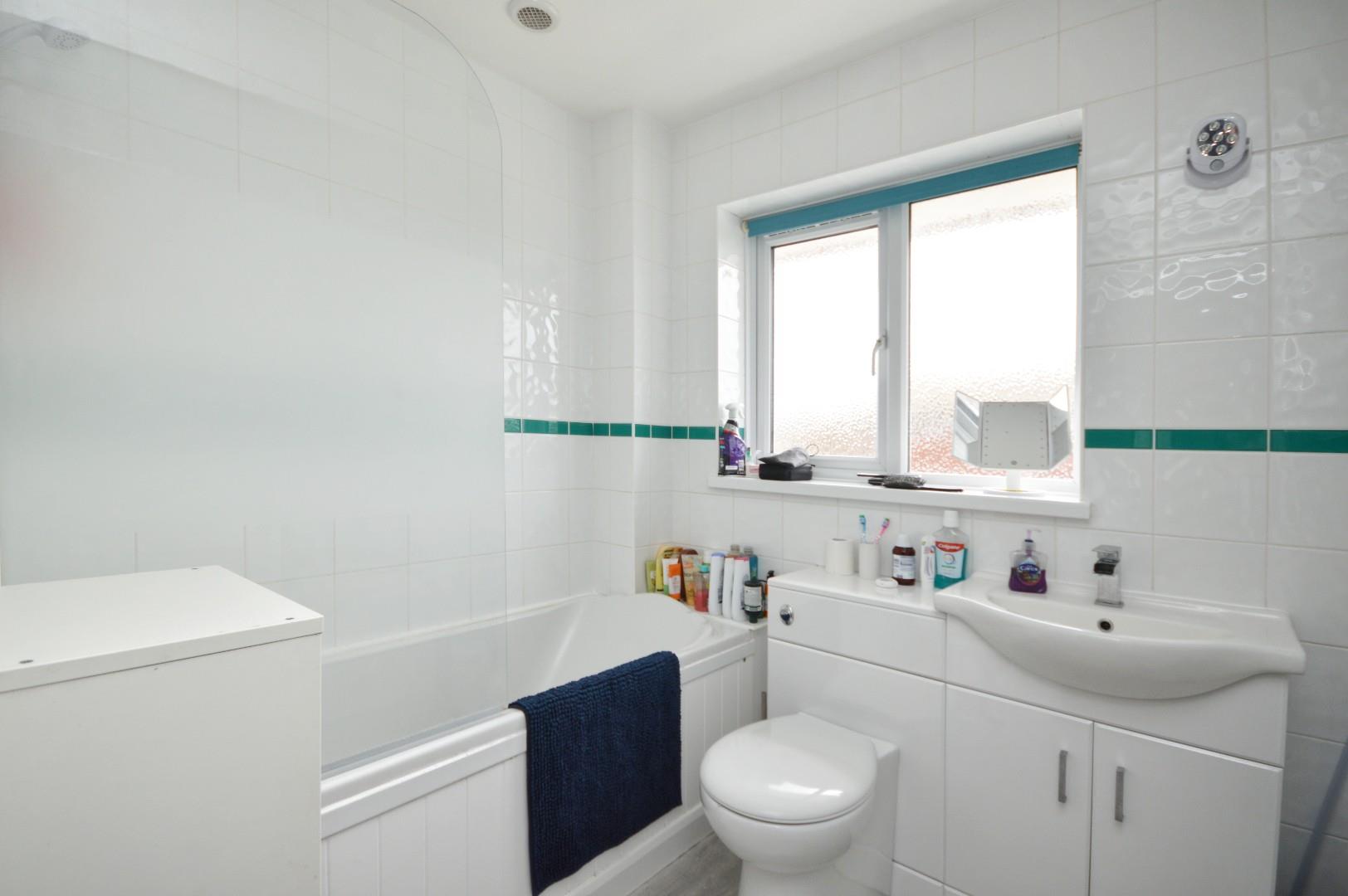 Obscured uPVC double glazed window to rear aspect, a fitted white suite comprising paneled bath with shower attachment over, wash hand basin with mixer tap and storage beneath, close coupled w/c, single radiator, extractor fan.