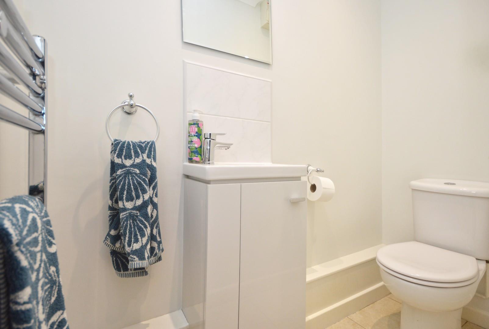 Suite comprising low level w/c, wash hand basin with mixer tap over and storage cupboard beneath, chrome heated towel rail, tiled flooring, coving, extractor, inset spots.