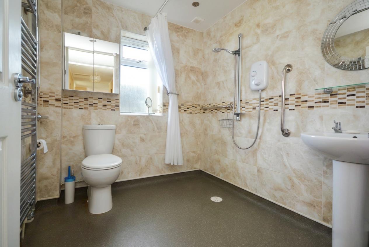 uPVC double glazed window to side aspect, wet room flooring with central drainage, Mira electric shower, low level WC, pedestal wash hand basin, shaver point, fully tiled walls, chrome heated towel rail, spotlights.
