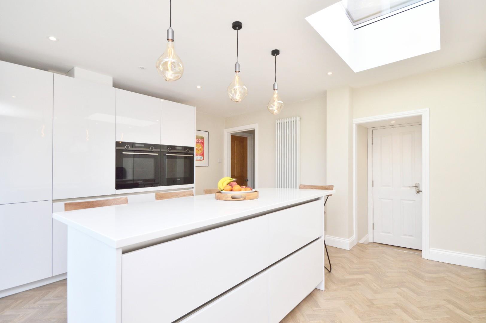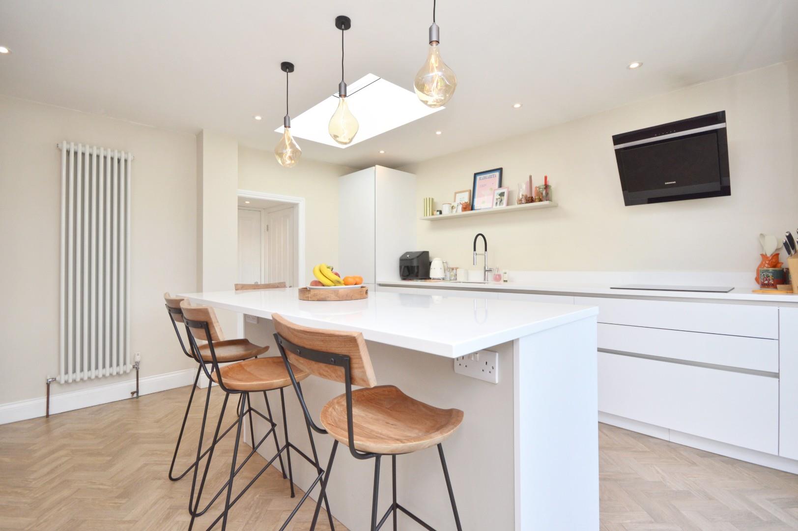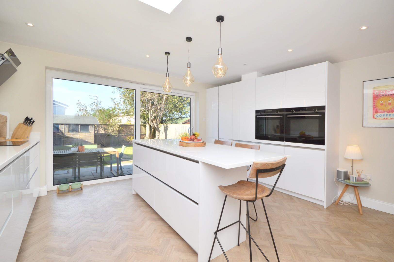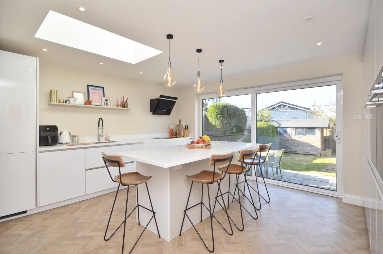 uPVC double glazed sliding doors to rear garden, recently fitted SCHMIT kitchen with a range of wall and base units, work surface over, integrated electric induction hob, fitted extractor fan, integrated double oven, integrated fridge freezer, integrated dishwasher, integrated washing machine, sink unit with mixer taps over, fitted island with breakfast bar and additional storage, spotlights, wall mounted radiator, door leading to WC and garage.