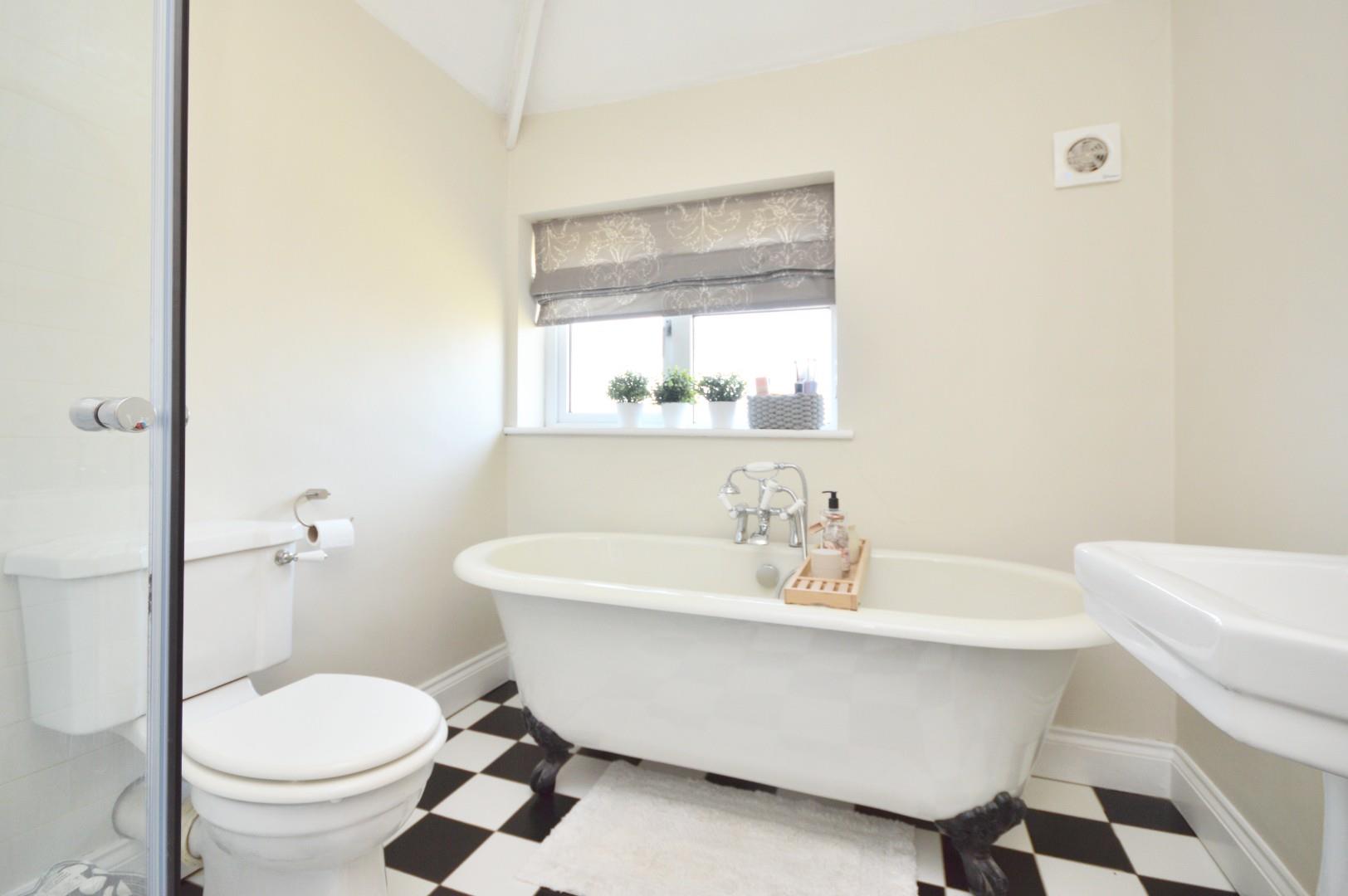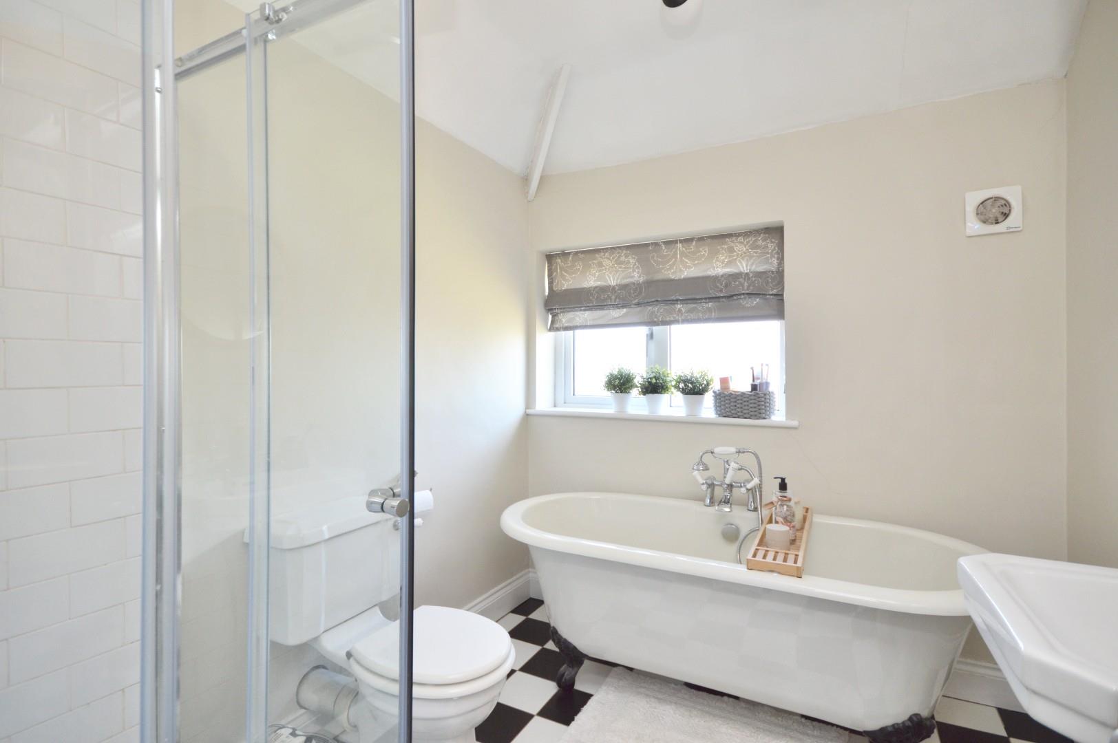 uPVC doubled glazed frosted window to rear aspect, free standing rolled top bath with mixer shower taps over, separate shower cubicle with rainfall attachment, close coupled WC, wash hand basin with taps over, towel rail, extractor fan,