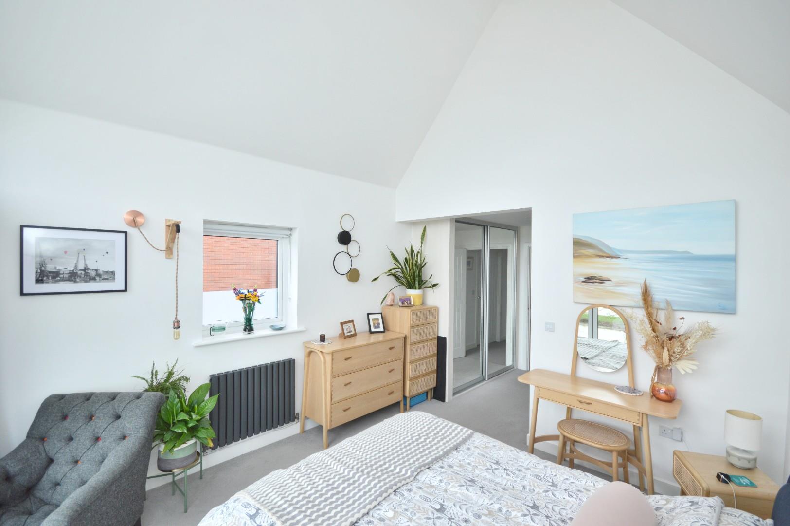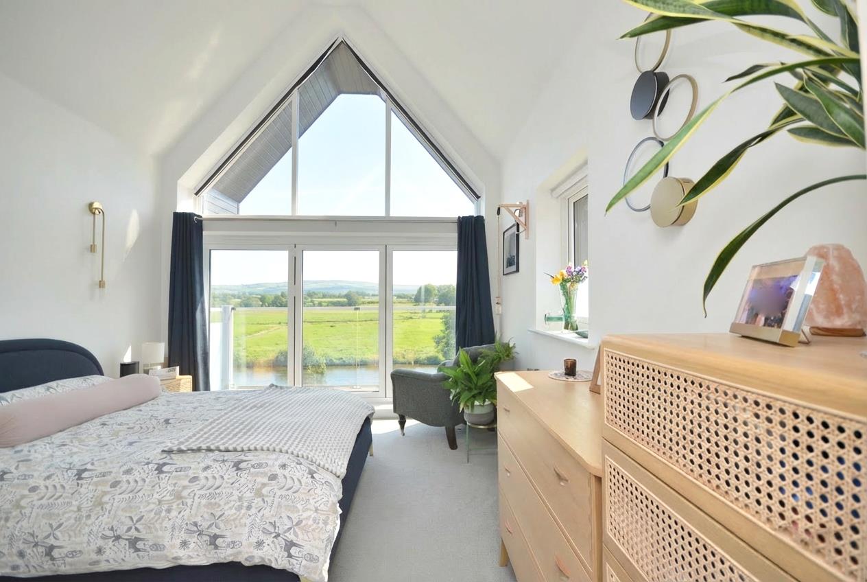 Double glazed window to side aspect, aluminum bi-folding doors to balcony with valuated double glazed windows above enjoying exception views over the river and fields towards Kelston, wall lights, double radiator, sliding mirrored wardrobes with hanging rail and shelving, door to