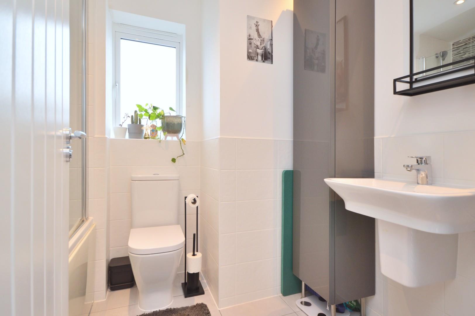 Obscured double glazed window to side aspect, suite comprising low level Roca w/c, wash hand basin with mixer taps over, tiled flooring, part tiled walls, heated towel rail, inset spots, extractor, fully tiled shower cubicle with sliding glazed door and mains shower over.