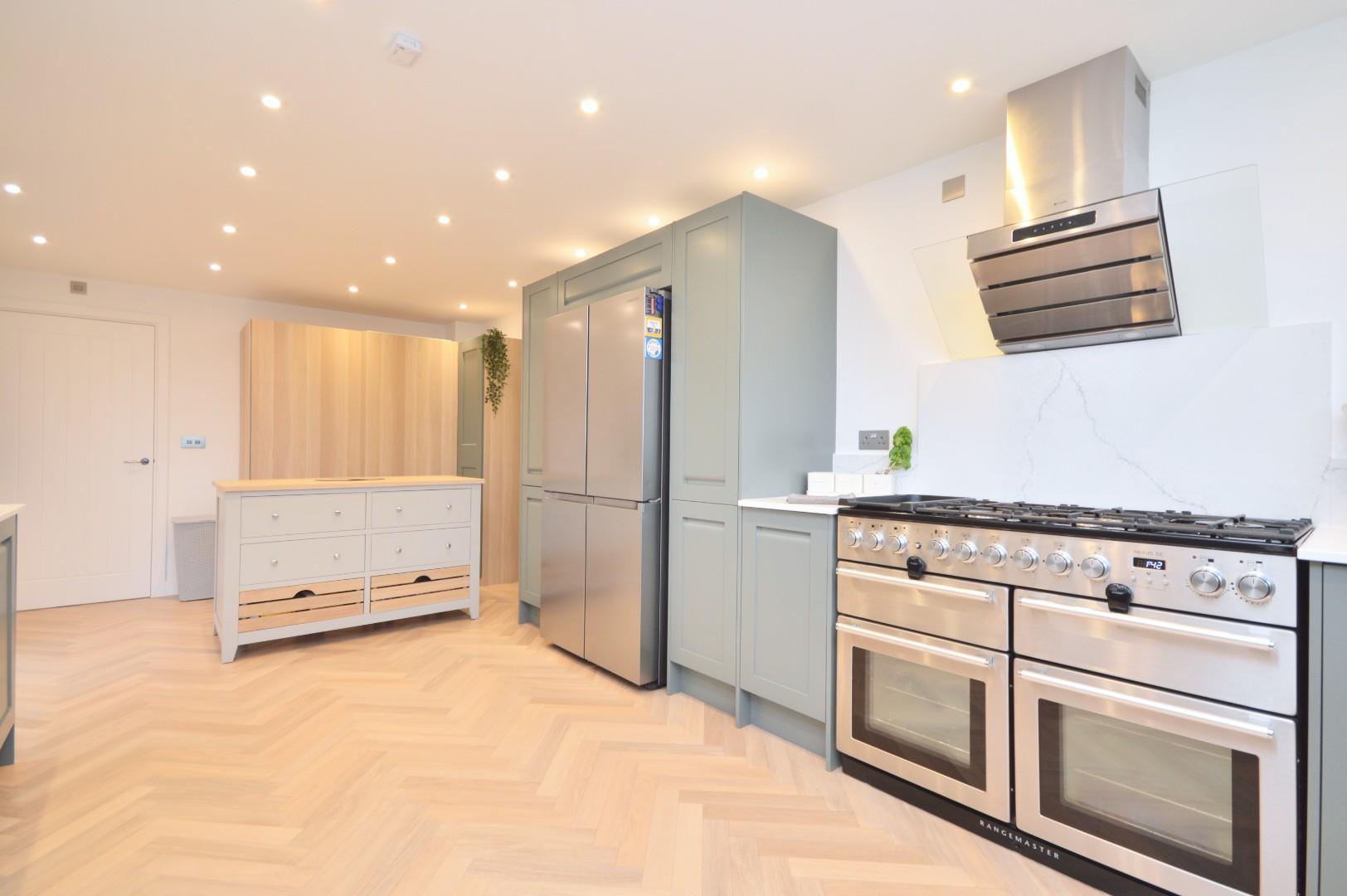 Double glazed French doors to patio and rear garden, double glazed window to side aspect, double glazed sliding windows to rear aspect, a range of wall and floor units with quartz worksurface over, quartz upstands and sills, 1 1/2 bowl sink unit with Quooker tap over, cupboard housing Ideal Logic boiler, space for 5 ring Rangemaster style cooker with quartz splash back and contemporary extractor hood with light over, pull out larder cupboard, pan drawers, integrated full sized Bosch dishwasher, integrated tumble drier and separate washing machine, inset spots, space and plumbing for American style fridge freezer, wall mounted contemporary radiator, slide opening cupboards for storing recycling bins, tiled flooring, inset spots.