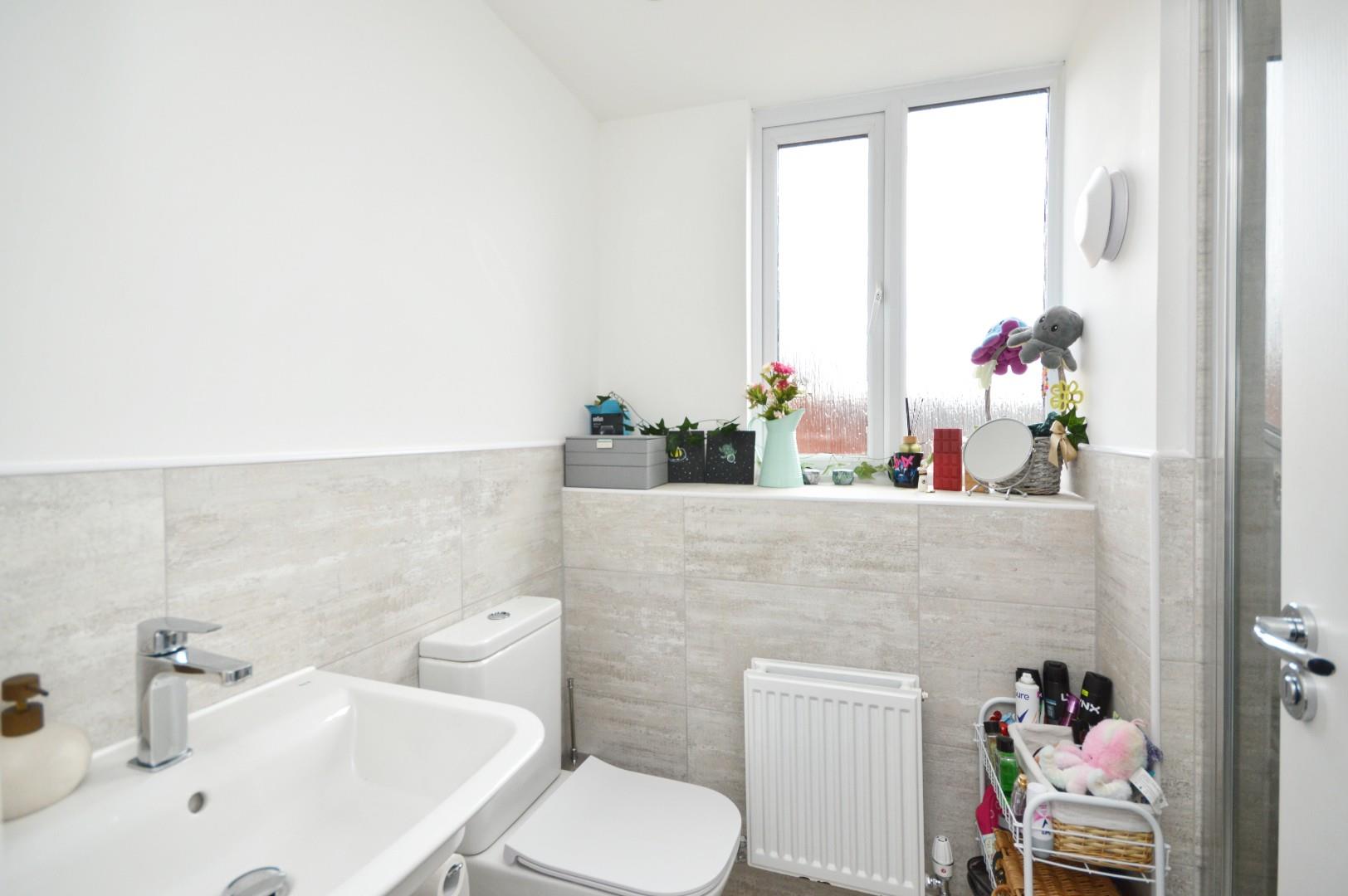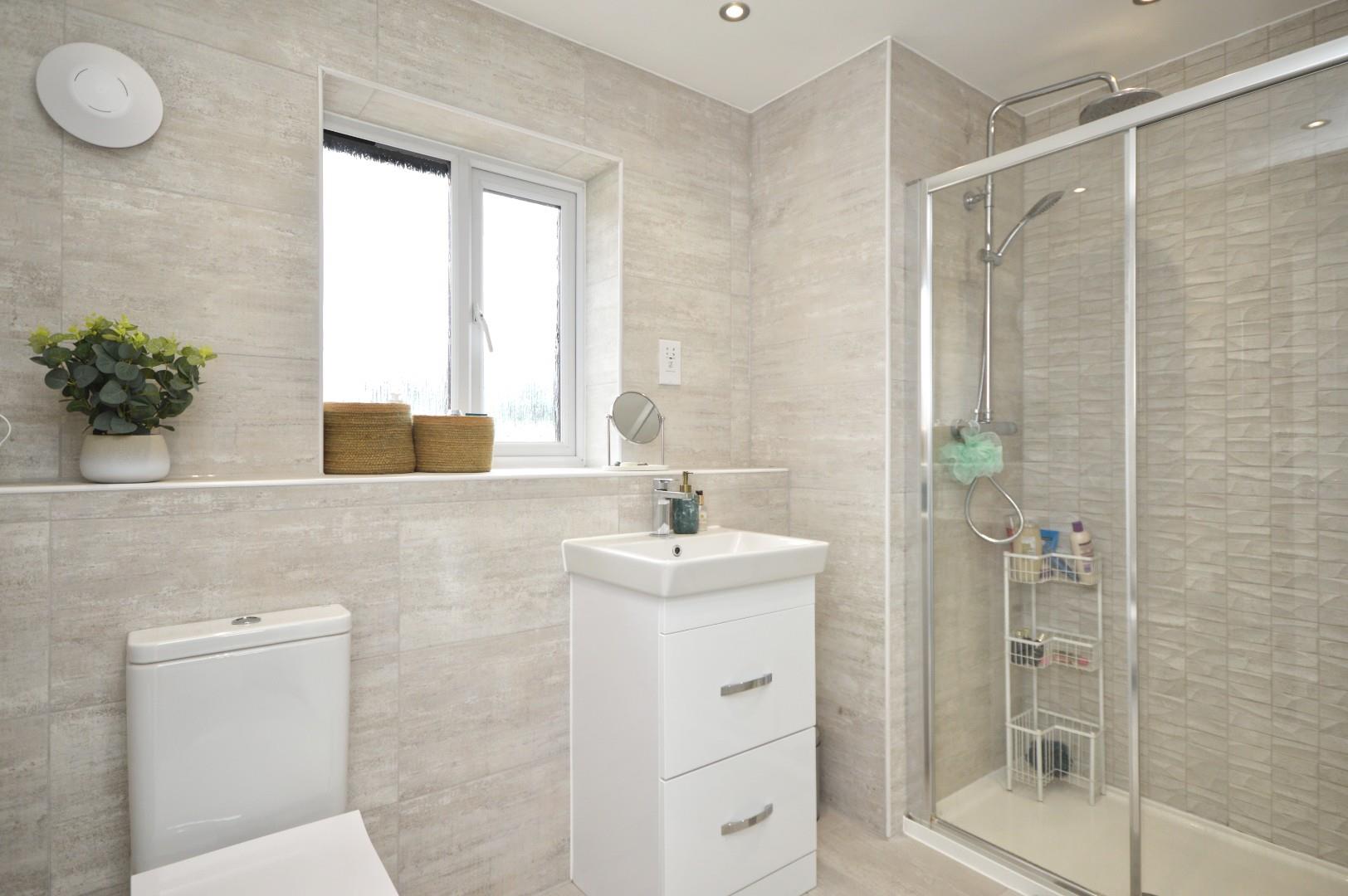 Obscured uPVC double glazed window to rear aspect, small double radiator, low level Roca w/c, wash hand basin with mixer taps over, tiled flooring, part tiled walls, fully tiled shower cubicle with sliding glazed door and mains shower over.