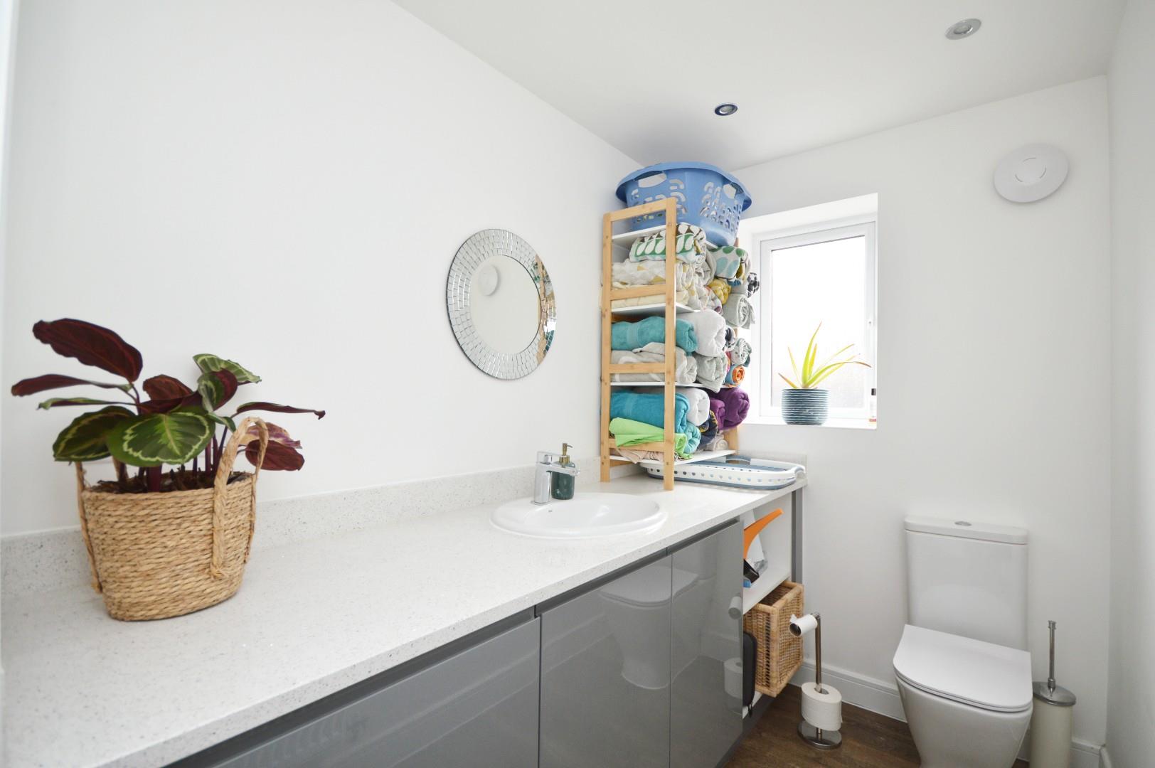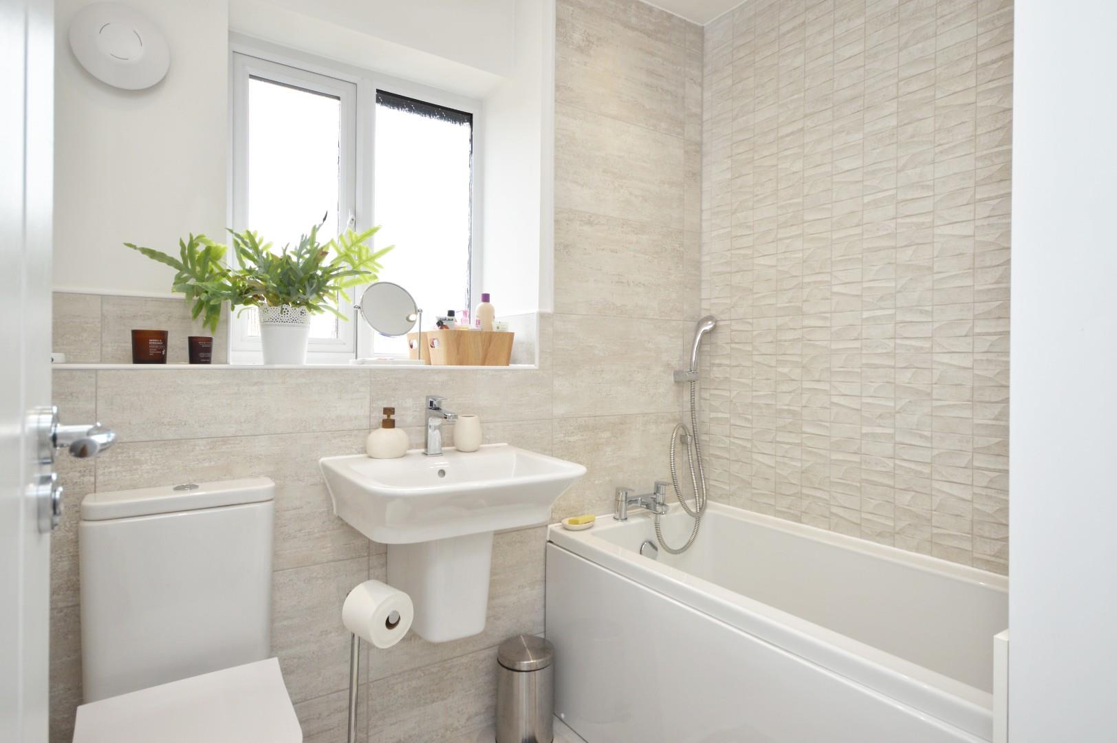 Obscured uPVC double glazed window to rear aspect, suite comprising low level Roca w/c, Roca wash hand basin with mixer taps over, paneled bath with shower attachment over, part tiled walls, tiled flooring, chrome heated towel rail, shaver point, inset spots and extractor.