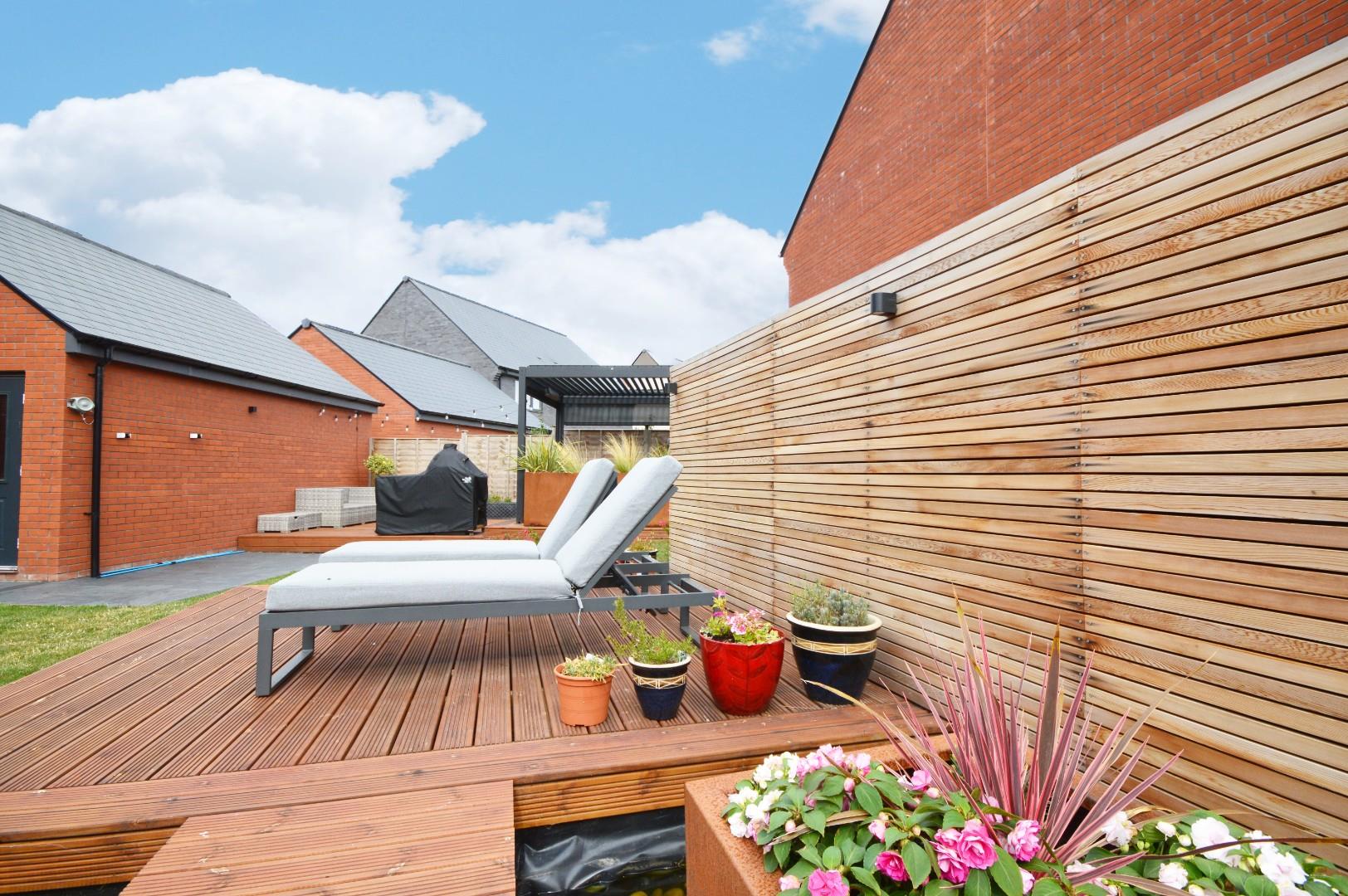 The front of the property is laid mainly to plum slate with a contemporary slabbed pathway with steps leading to the front door for ease of maintenance., access to the double garage is to the side. The rear garden has a patio area immediately adjacent to the property ideal for al fresco dining and offering a good degree of privacy, there is a further area to the rear of the garage which is laid to decking with a fixed pergola ideal for further garden furniture, the remainder is laid mainly to a level lawn with a slightly raised wooden sun terrace with water feature and raised planters with shrubs. The rear garden is enclosed by wooden featheredge fencing and a brick wall. Pedestrian access is to the side of the property via a wooden gate. There is also an area for storing bins etc.