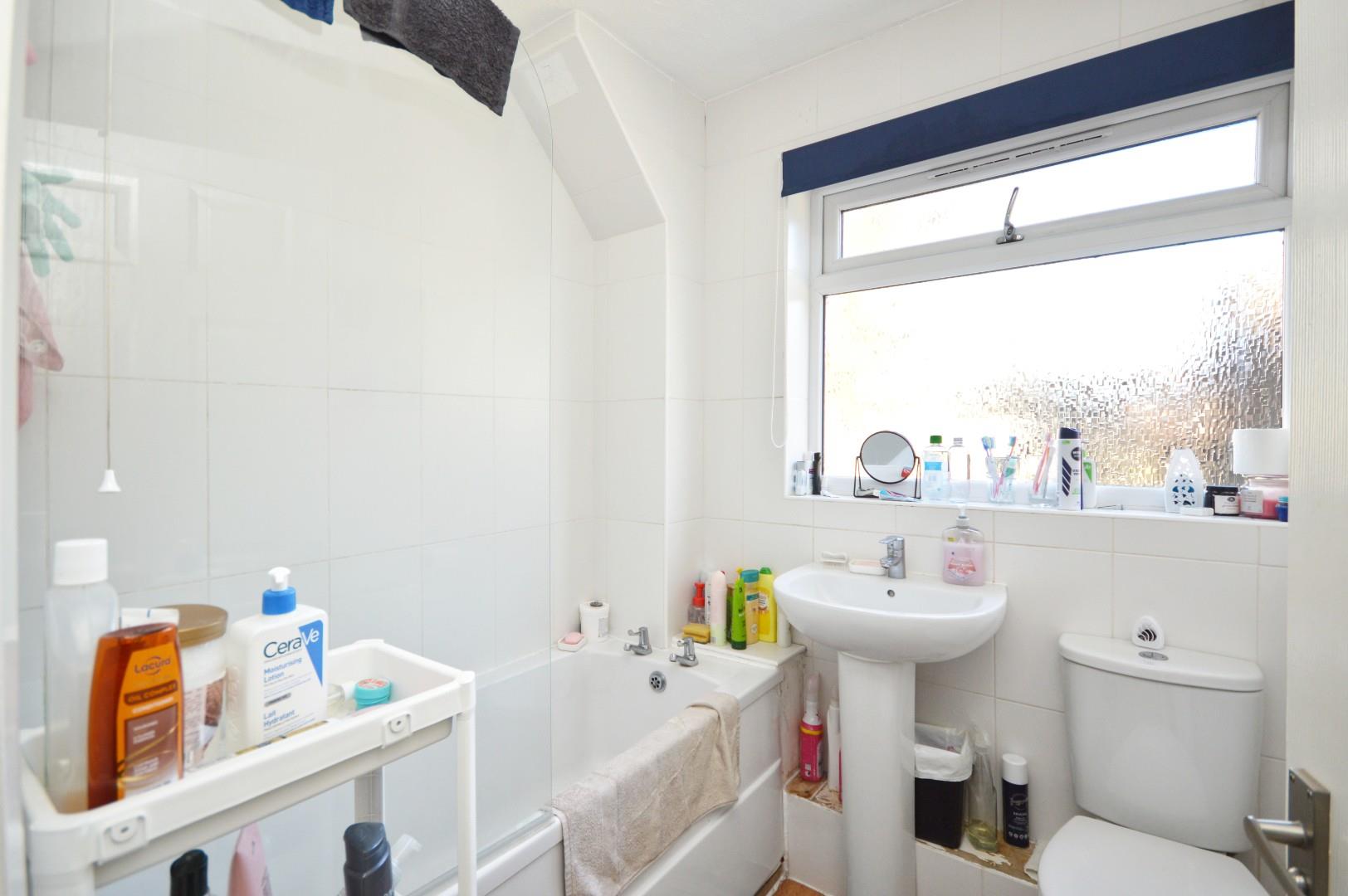 Obscured uPVC double glazed window to side aspect, suite comprising panelled bath with shower attachment over, pedestal wash hand basin with mixer taps over, close coupled w/c, single radiator.