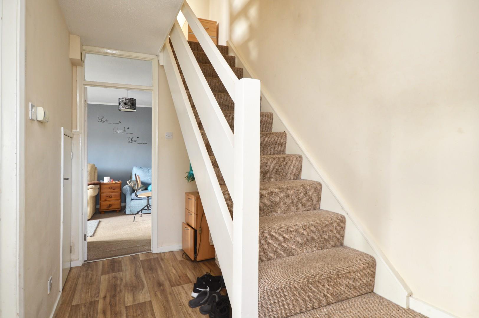Stairs rising to first floor landing, understairs storage cupboard, single radiator, doors to