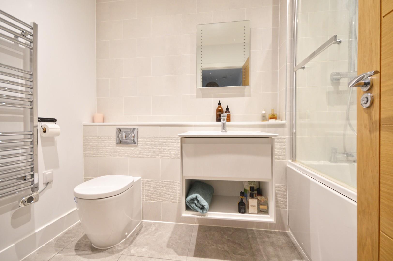 Suite comprising p-shaped bath with rainfall shower attachment over, wash hand basin with mixer taps over and storage beneath, close coupled w/c, heated towel rail, spot lights, extractor fan, tiled walls, tiled flooring.