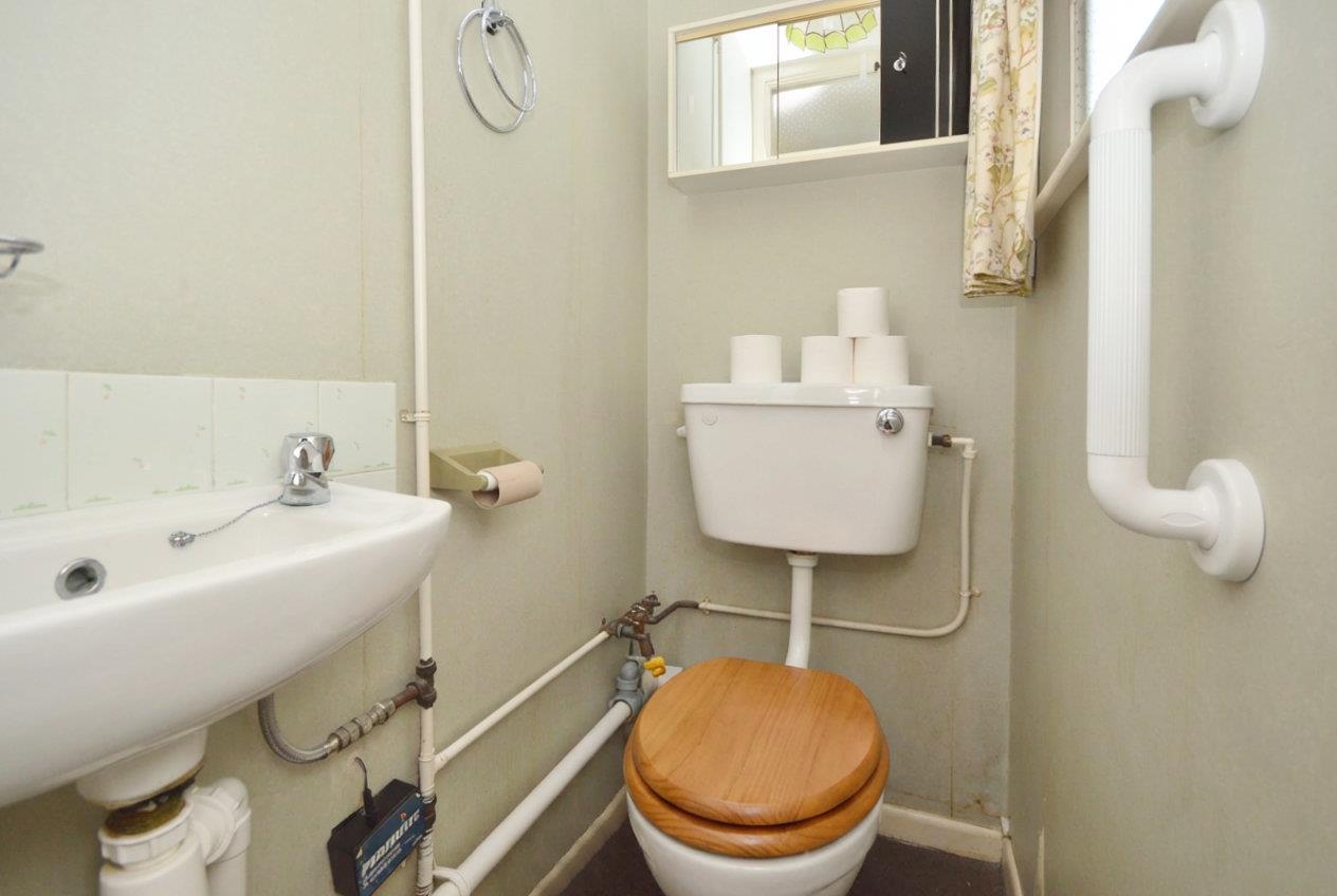 Frosted window to side aspect, close coupled w/c, wash hand basin with taps over.