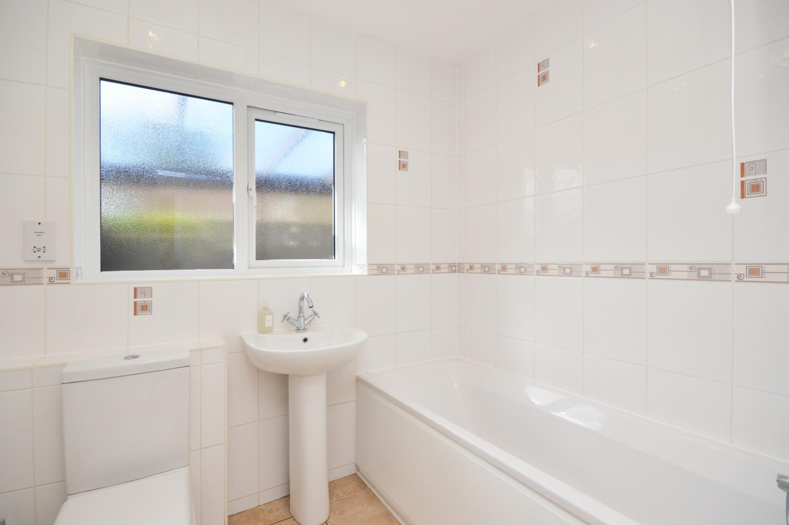 Obscured UPVC double glazed window to side aspect, suite comprising low level WC, pedestal wash hand basin with mixer taps, paneled bath with shower attachment, fully tiled, extractor fan and heated towel rail