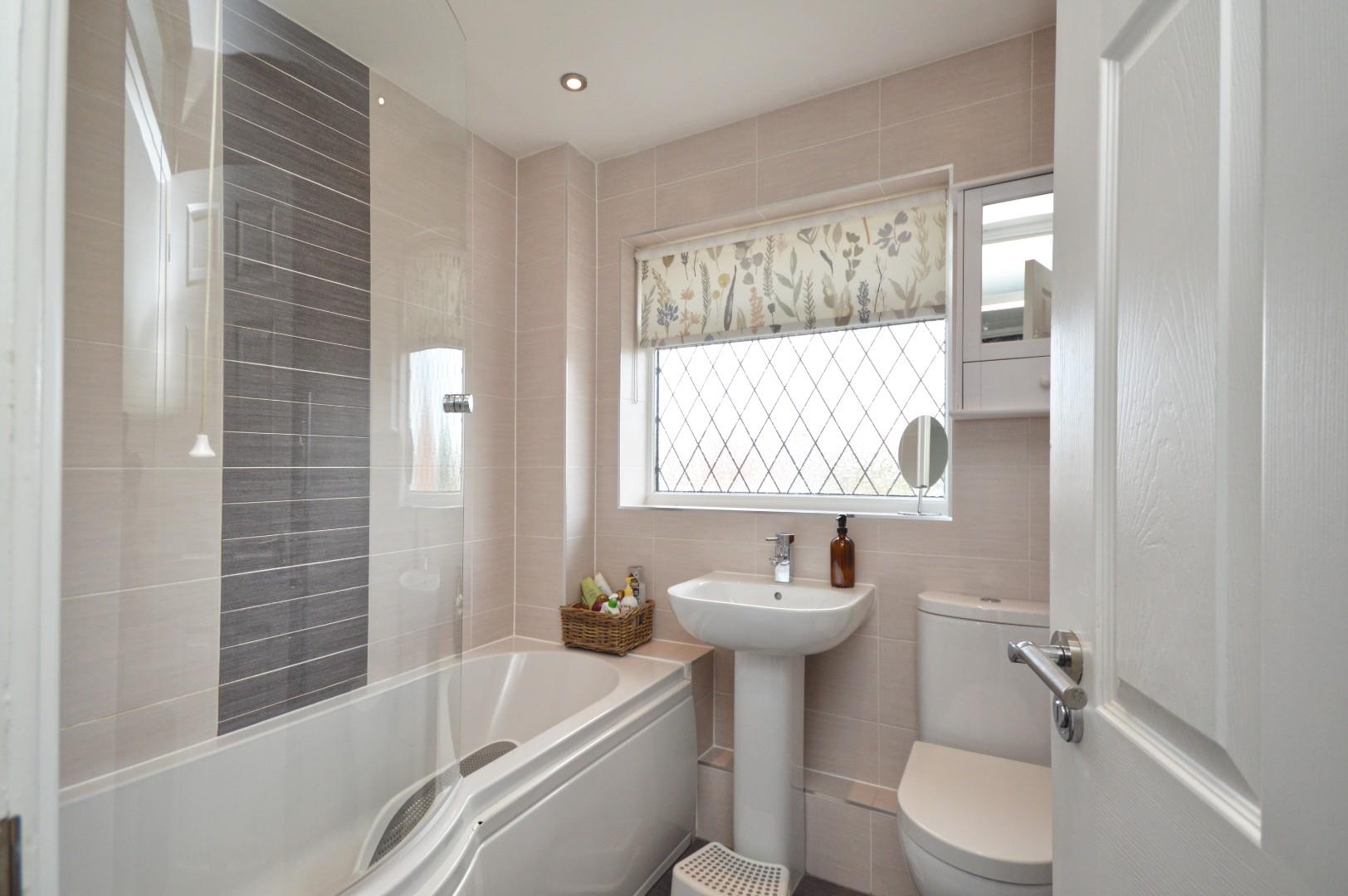 Obscured uPVC double glazed window to rear aspect, white suite comprising paneled bath with shower attachment over, pedestal wash hand basin with mixer tap, close coupled w/c, heated towel rail, fully tiled, spotlights.