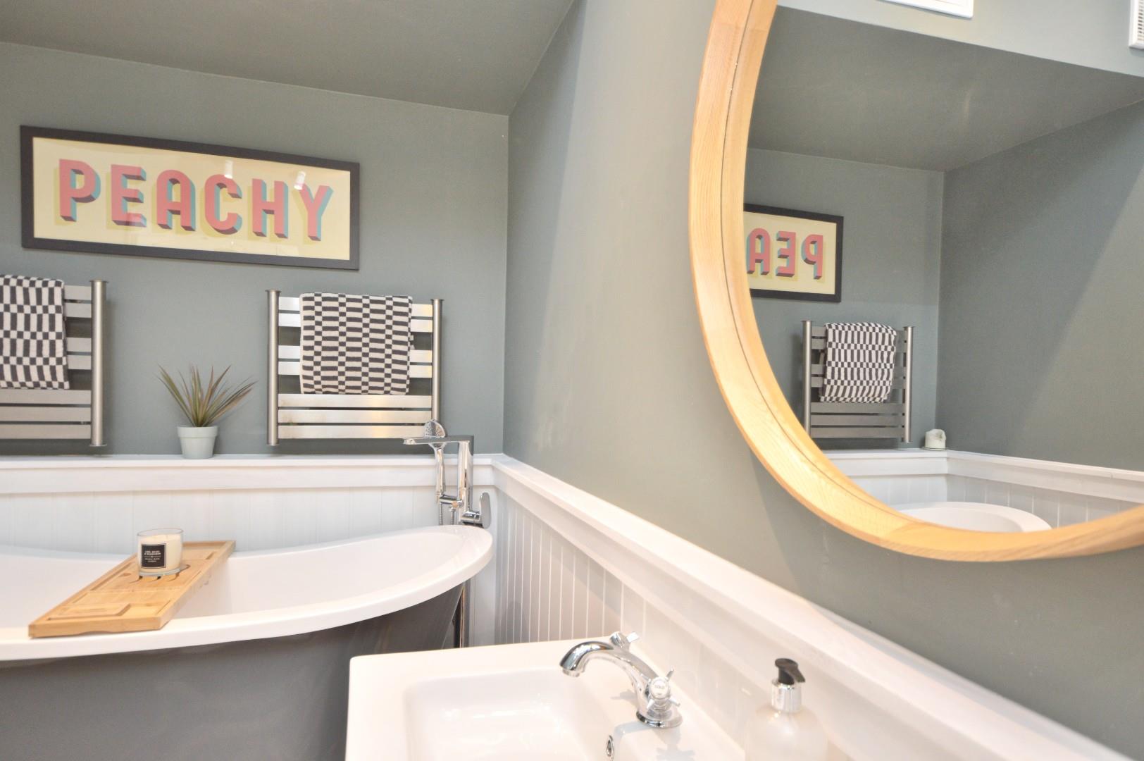 Velux window, wood flooring, suite comprising low level w/c, freestanding bath with shower attachment and tap over, double sinks with storage beneath, fully tiled corner shower cubicle with hinged glazed door and mains rainfall shower with separate attachment over, vaulted ceiling, exposed wooden beams, downlighters, 2 brushed steel radiators, part low level panelled walls, extractor.