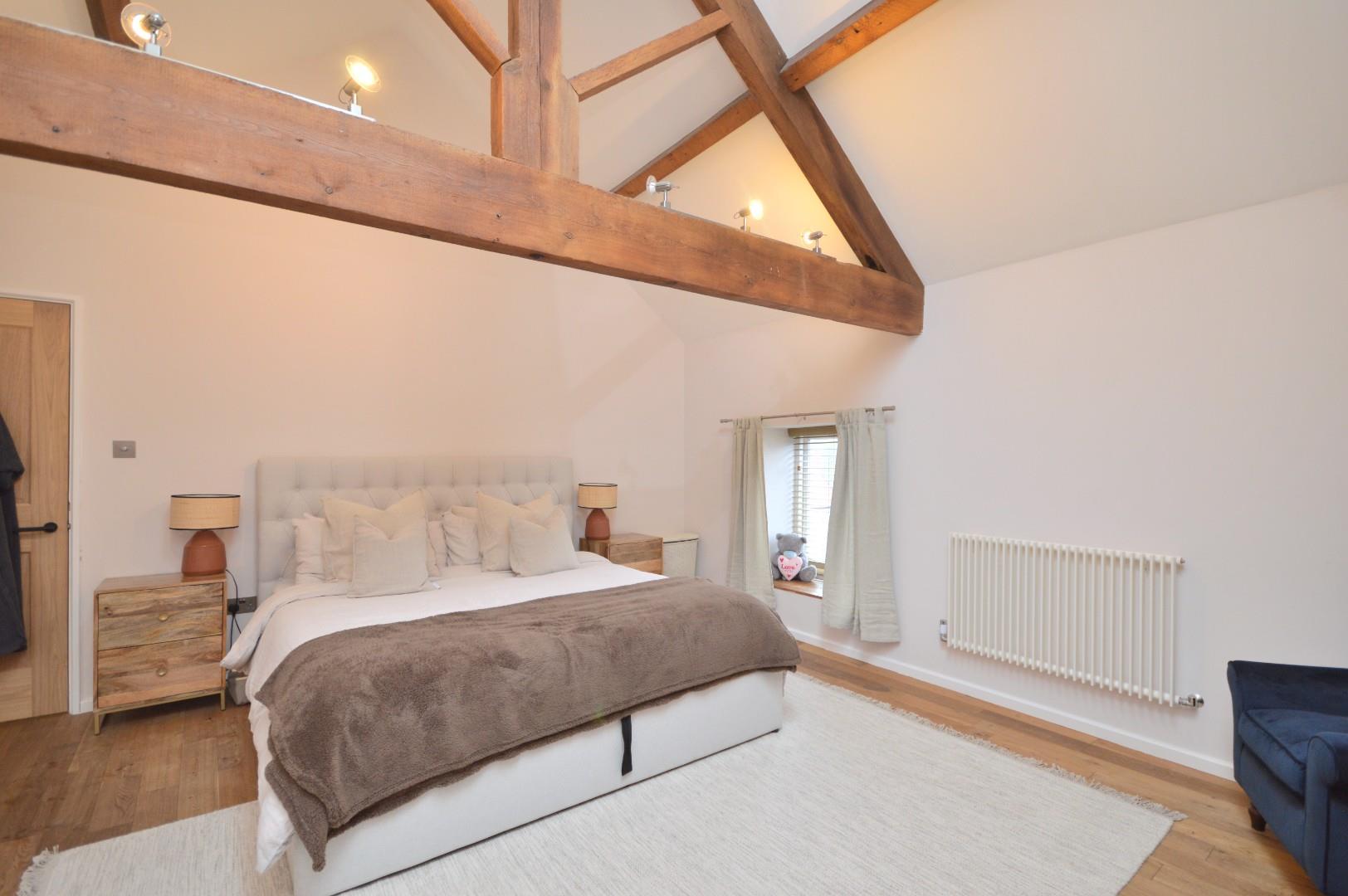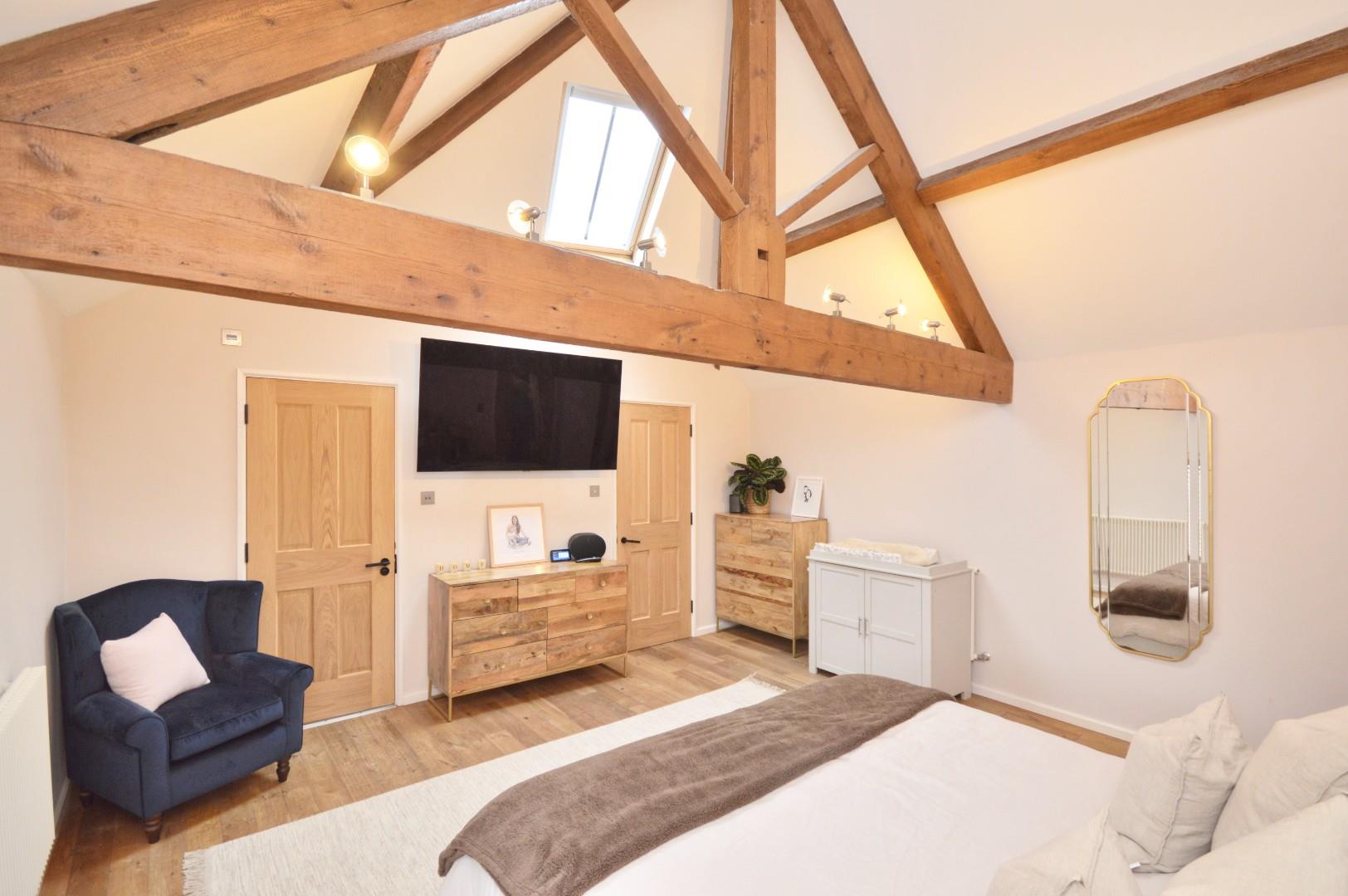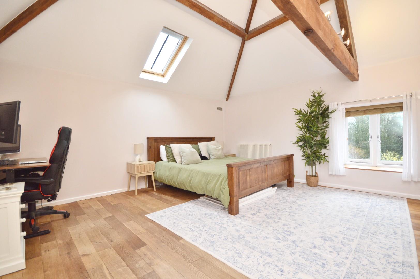 Double glazed window to front aspect, radiator, wooden beams with lighting, large Velux window, wood flooring, large storage cupboard with shelving and hanging space, door to