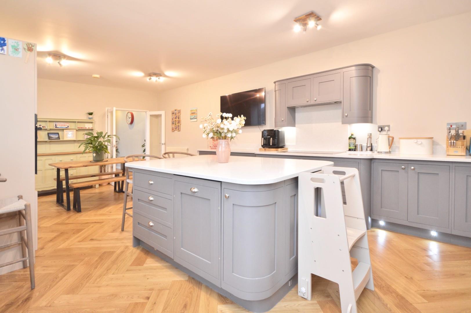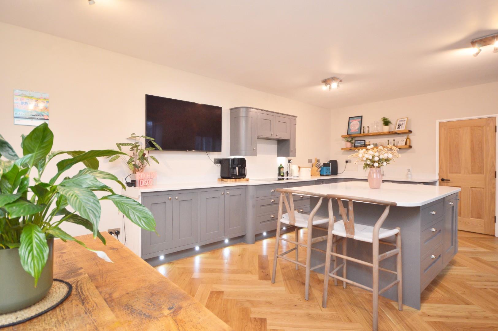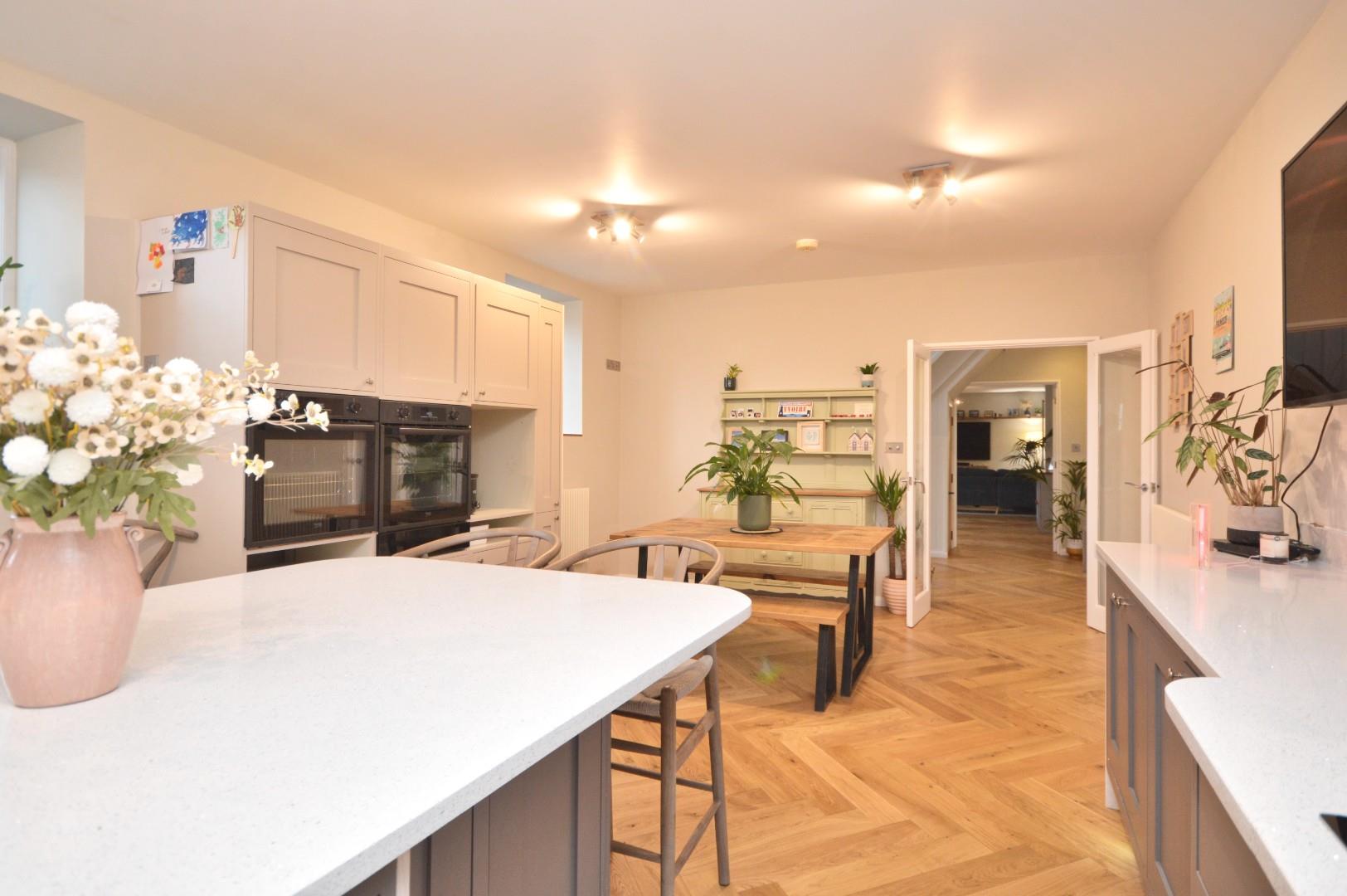 Double glazed windows to front aspect, stable style door to front aspect, wood flooring, 3 radiators, a range of mainly floor units with Quartz work surfaces over, 1 1/2 bowl Villeroy and Boch sink unit with mixer taps over, Bosch induction hob with extractor hood and Quartz splash back, under unit lighting, large central island with Quartz work surface over and ample storage beneath, integrated full sized dishwasher, area for bar stools, space and plumbing for American style fridge freezer, separate area with further storage space, opening for microwave and double oven/grill and warming drawer, door to