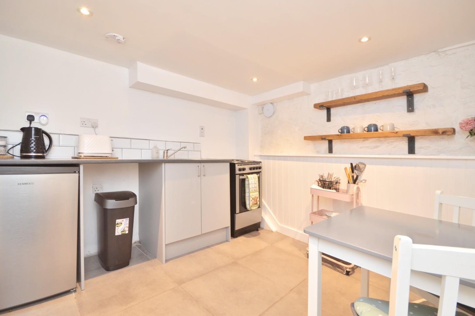 Tiled flooring, a range of wall and floor units with work surface over, period style radiator, inset spots, space and plumbing for washing machine, opening to storage cupboard with space for tumble drier, space for hanging coats,door to