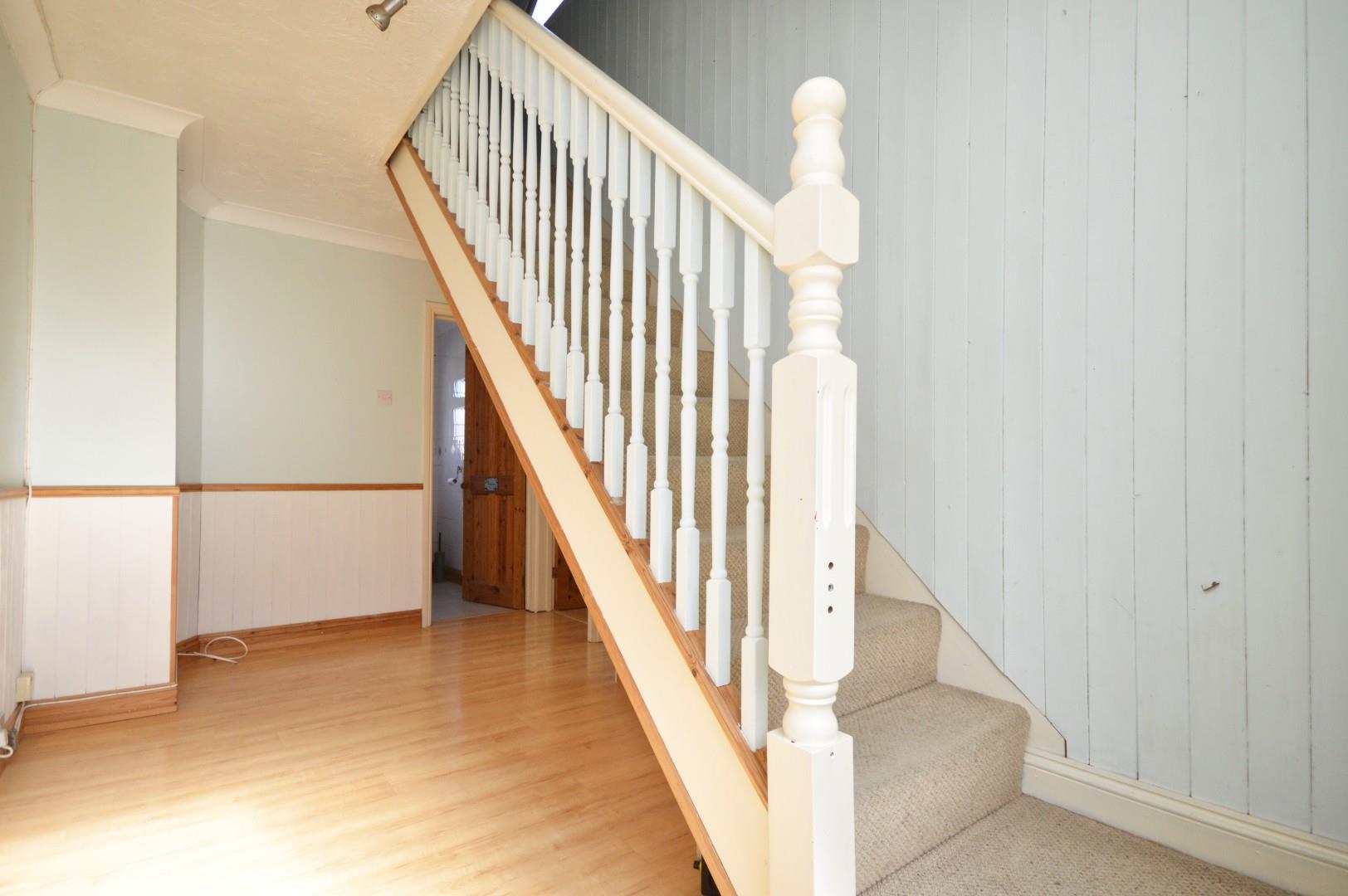 Stairs rising to first floor landing, 2 double radiators, wood effect flooring, opening to