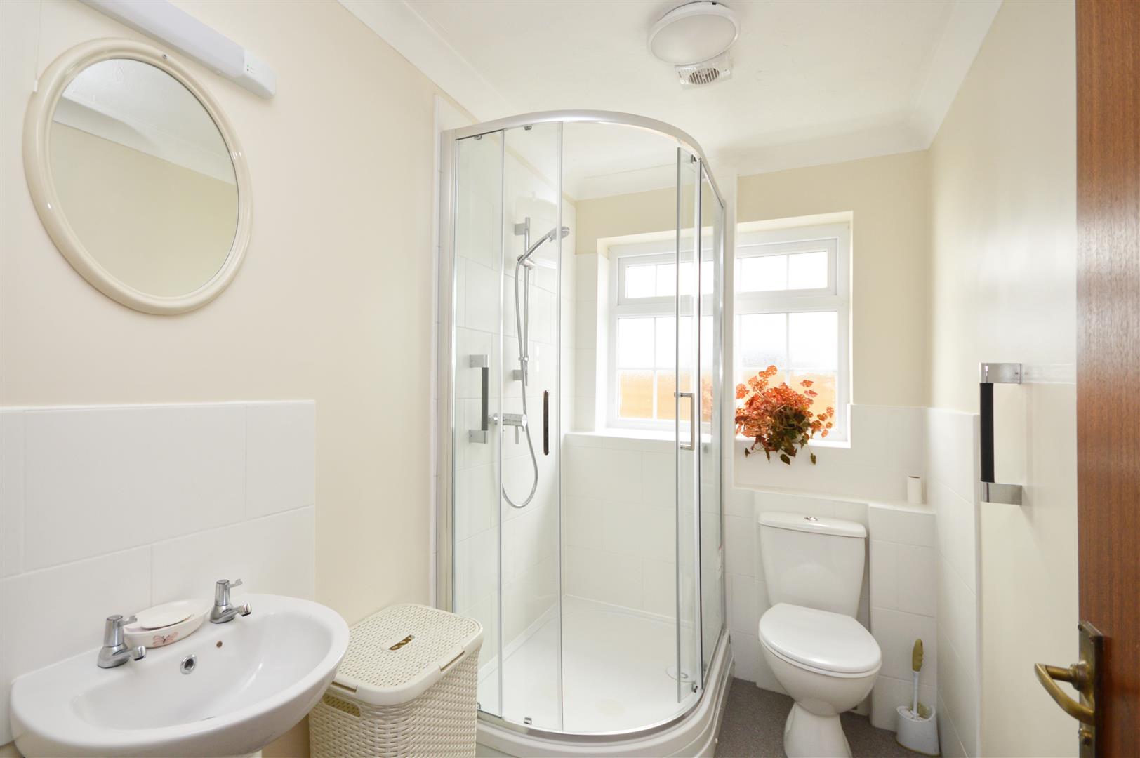 Obscured uPVC double glazed window to side aspect, shower cubicle with shower attachment over, close coupled w/c, wash hand basin with taps over, heated towel rail.