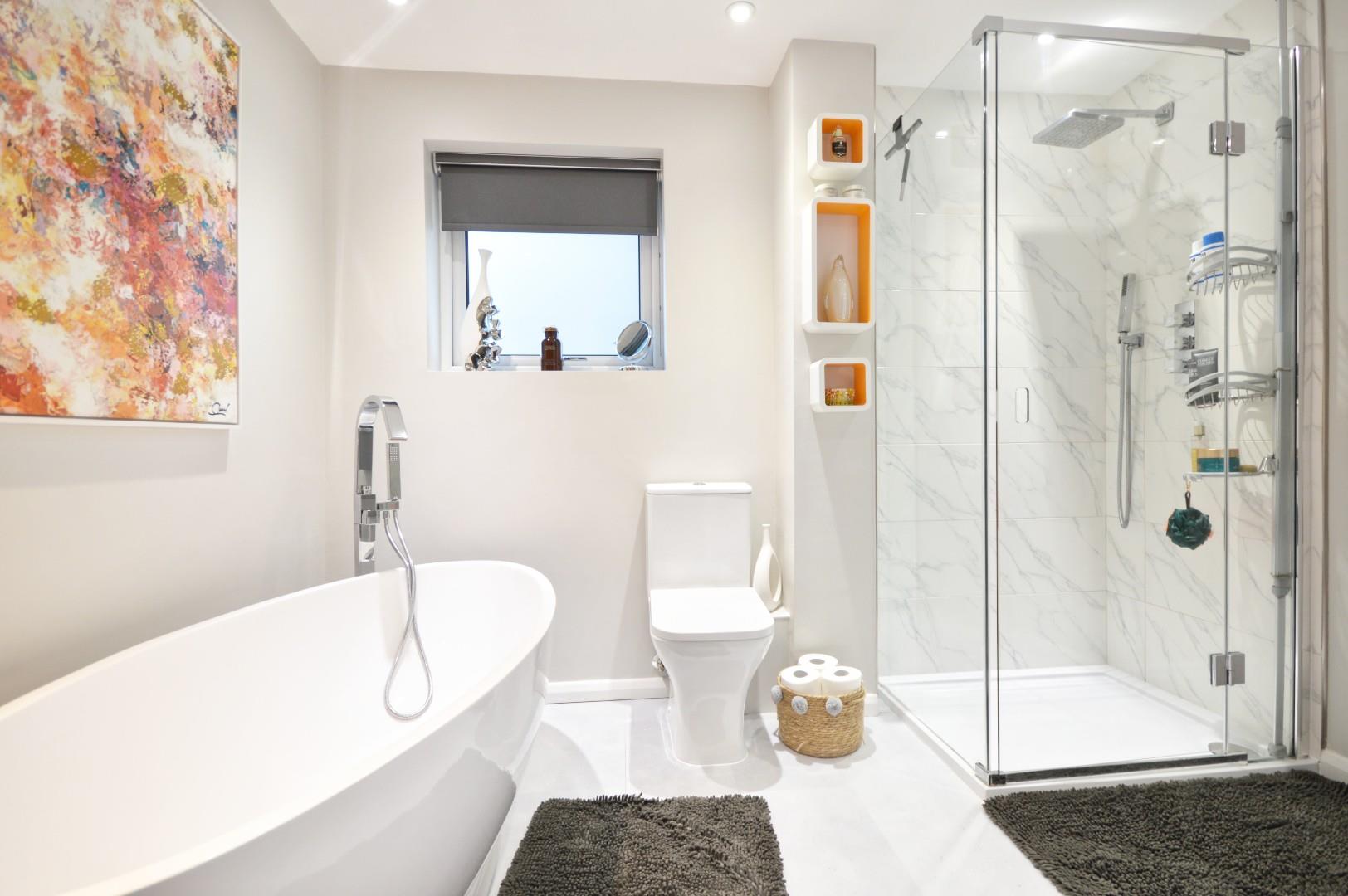 UPVC double glazed frosted glass window to side aspect, oval shaped free standing / double ended bath with mixer taps and shower attachment, separate shower cubicle with rainfall shower attachment, wash hand basin with mixer taps and storage beneath, heated towel rail, tiled effect flooring, spot lights