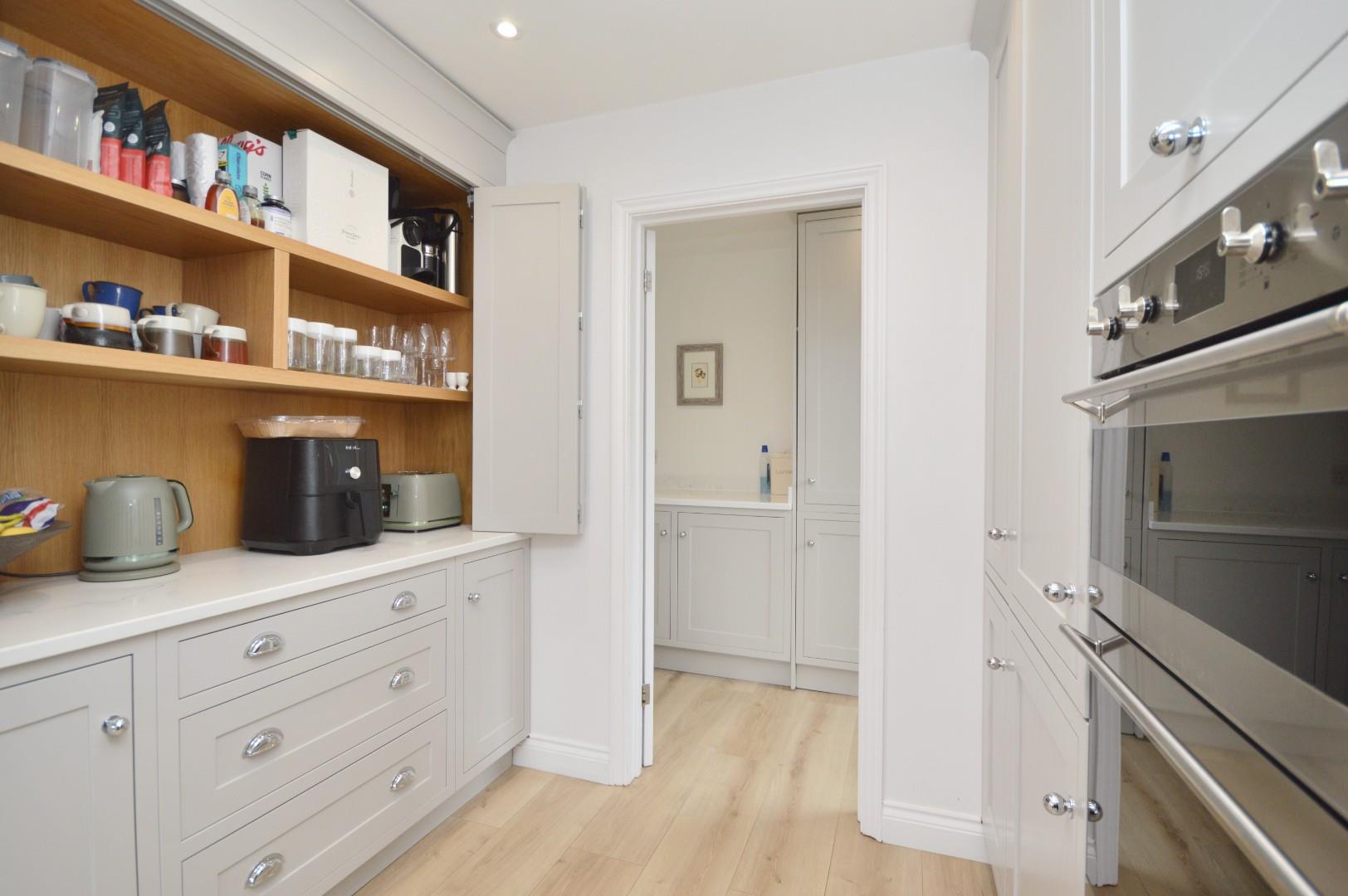 uPVC obscure window to side aspect, cupboard with space and plumbing for washing machine and tumble dryer, cupboard housing Worcester combination boiler, quartz worksurfaces, storage cupboard, double radiator, inset spot lights.