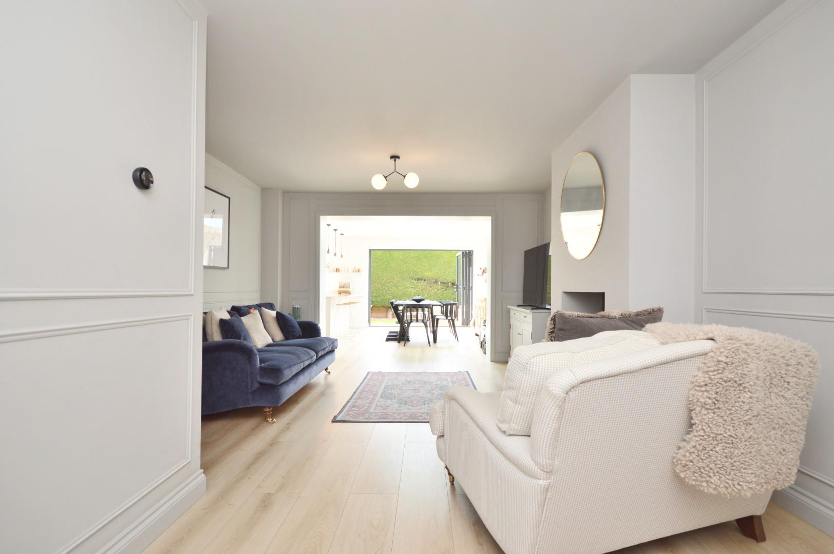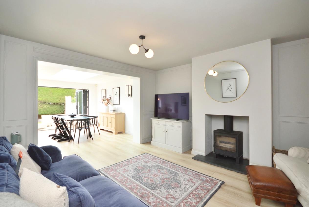Multi glazed door, uPVC double glazed high level window to side aspect, L shaped open plan room, featured wall panels, feature wood burning stove, granite hearth, large period style radiator, door to understairs cupboard, door leading into play room, coving, leads into kitchen diner