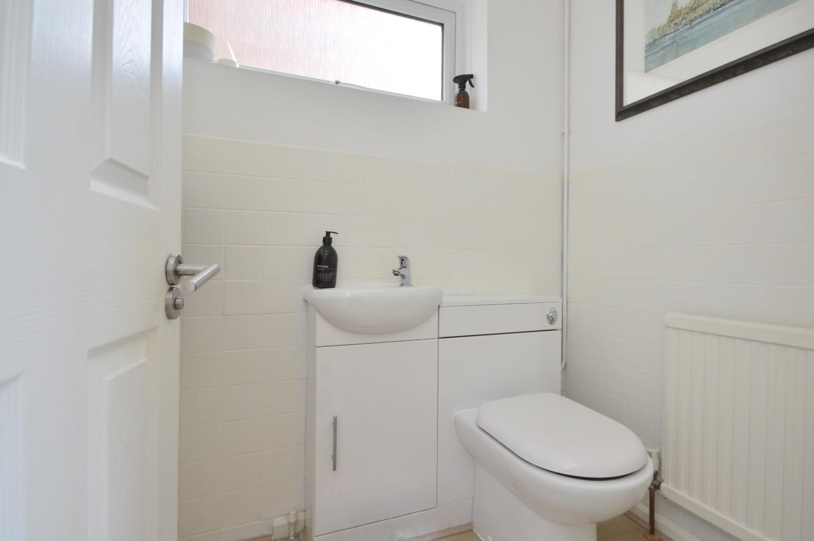 uPVC double glazed obscure window to side aspect, part tiled walls, wooden effect flooring, low level WC, wash hand basin, mixer tap over, single panel radiator