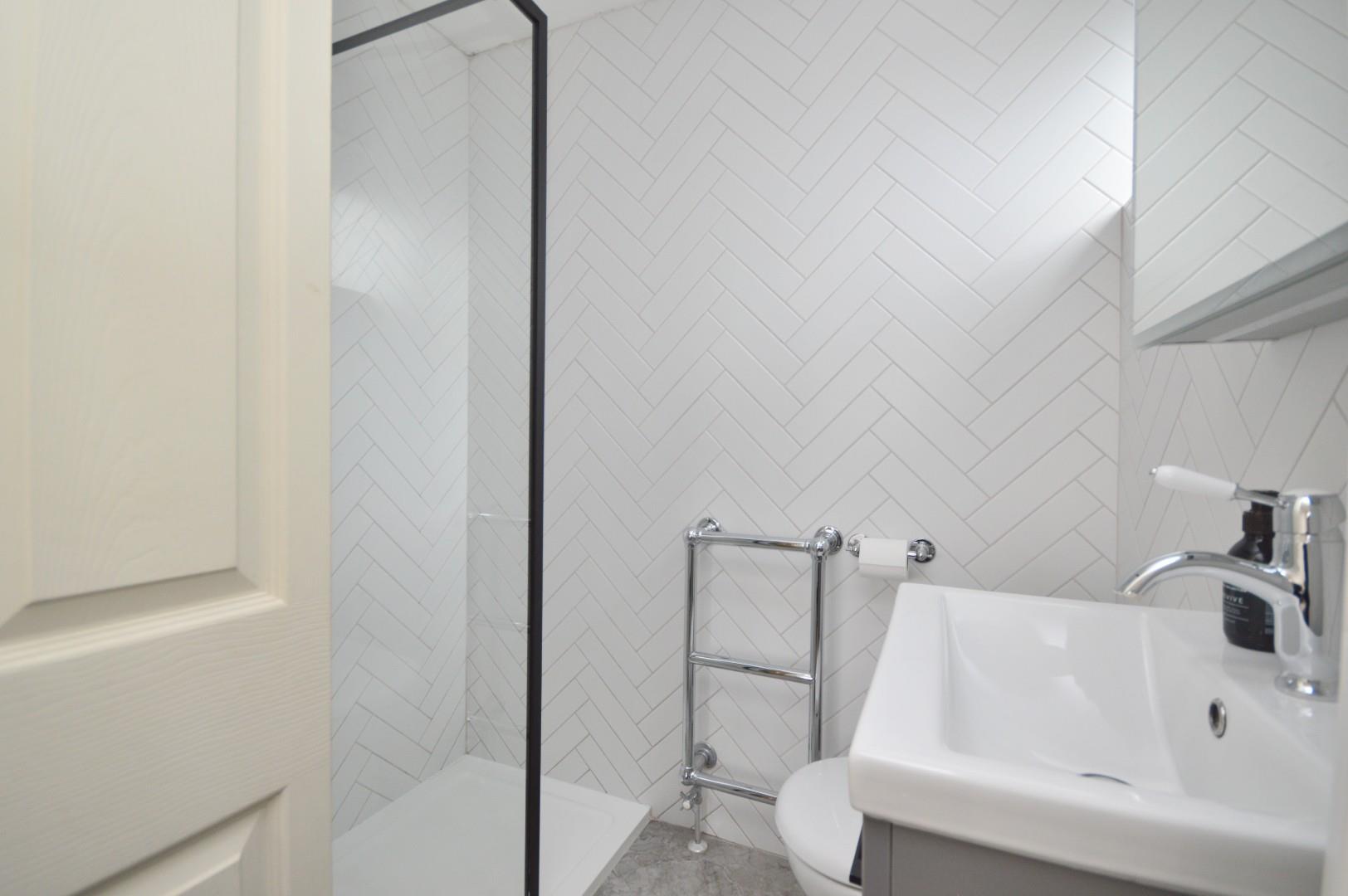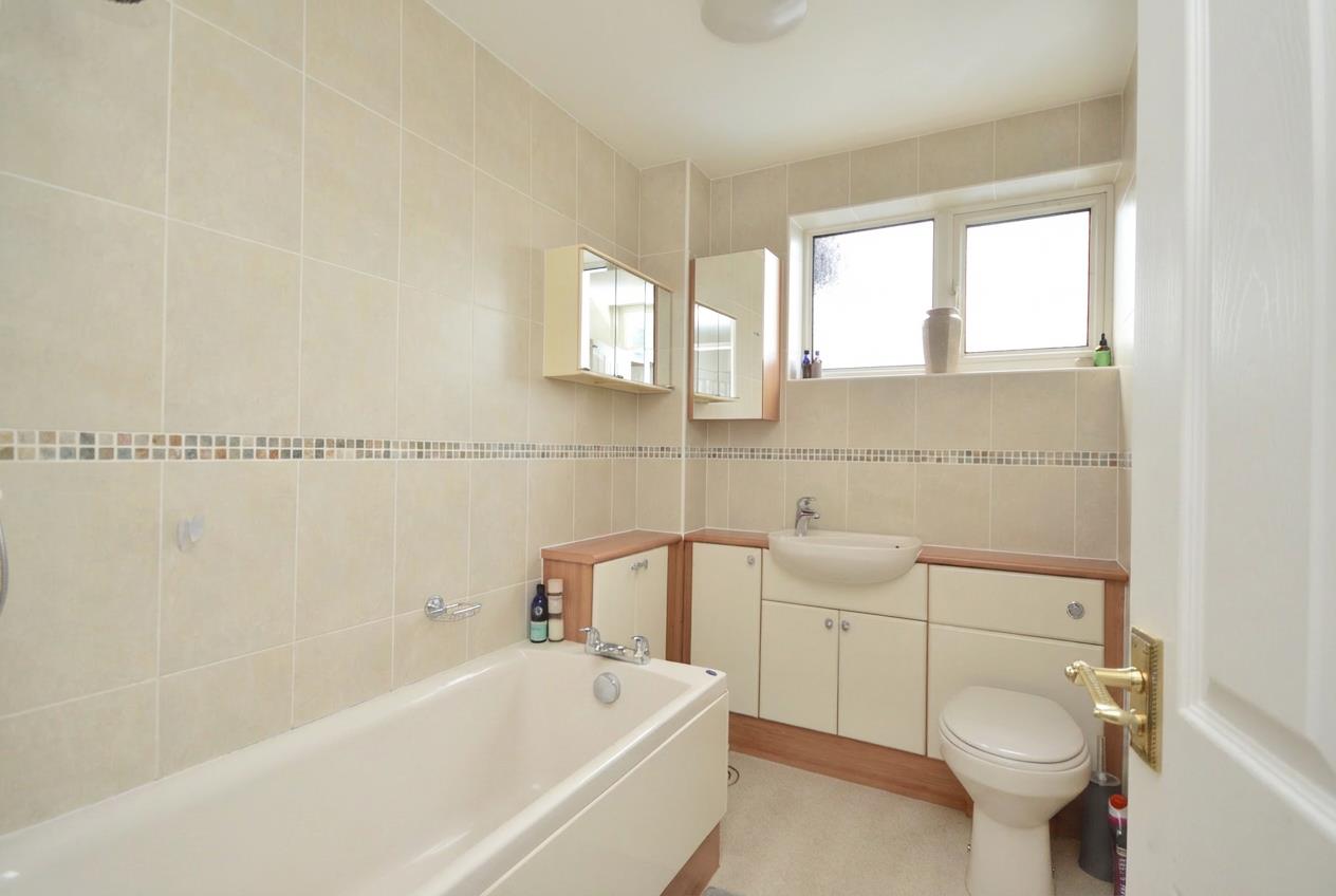 Obscured uPVC double glazed window to rear aspect, suite consisting concealed cistern w/c, wash hand basin with mixer taps over and storage drawers beneath, panelled bath with hinged glazed shower screen and shower attachment over, fully tiled walls, wall mounted heated towel rail.