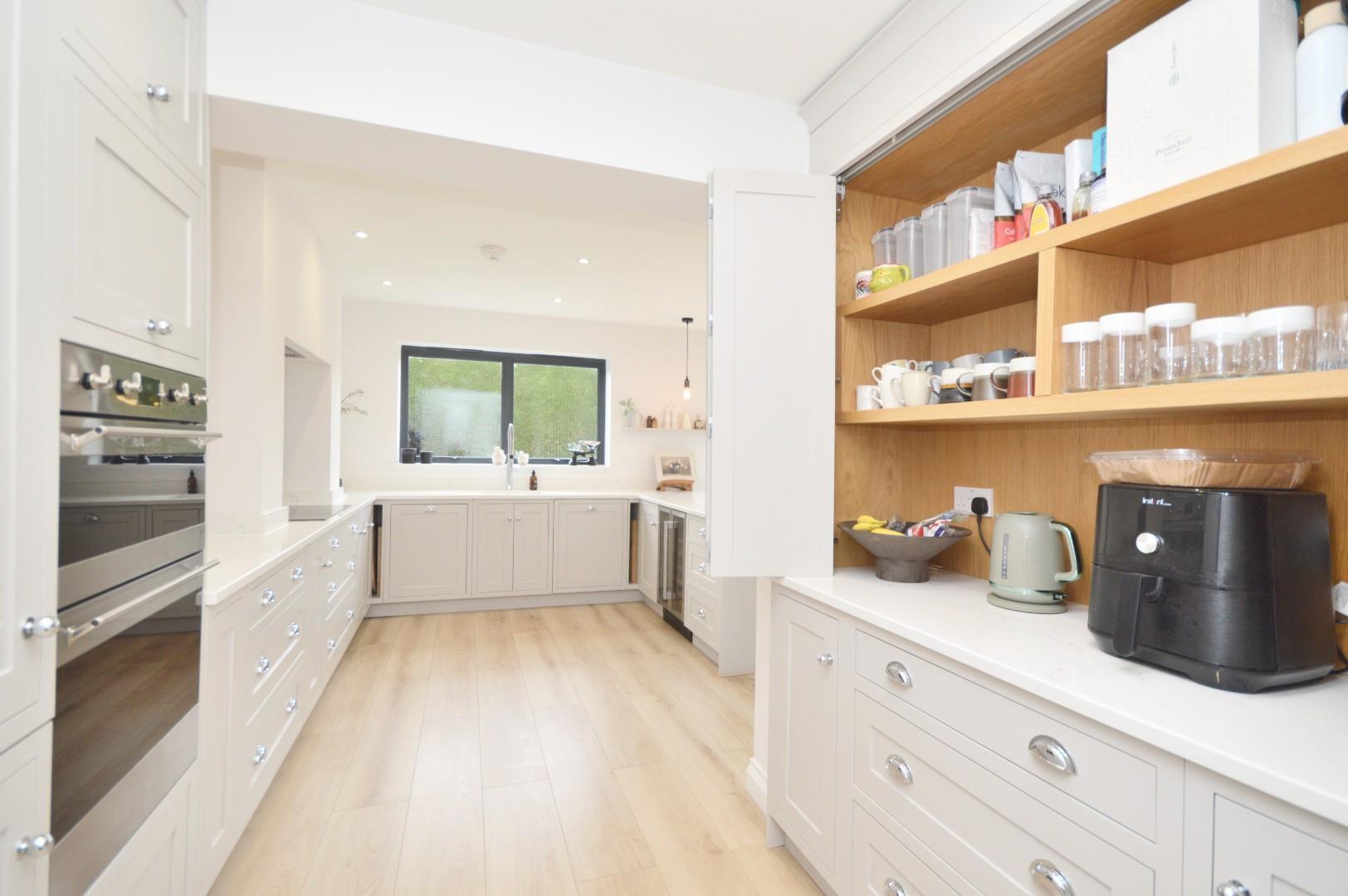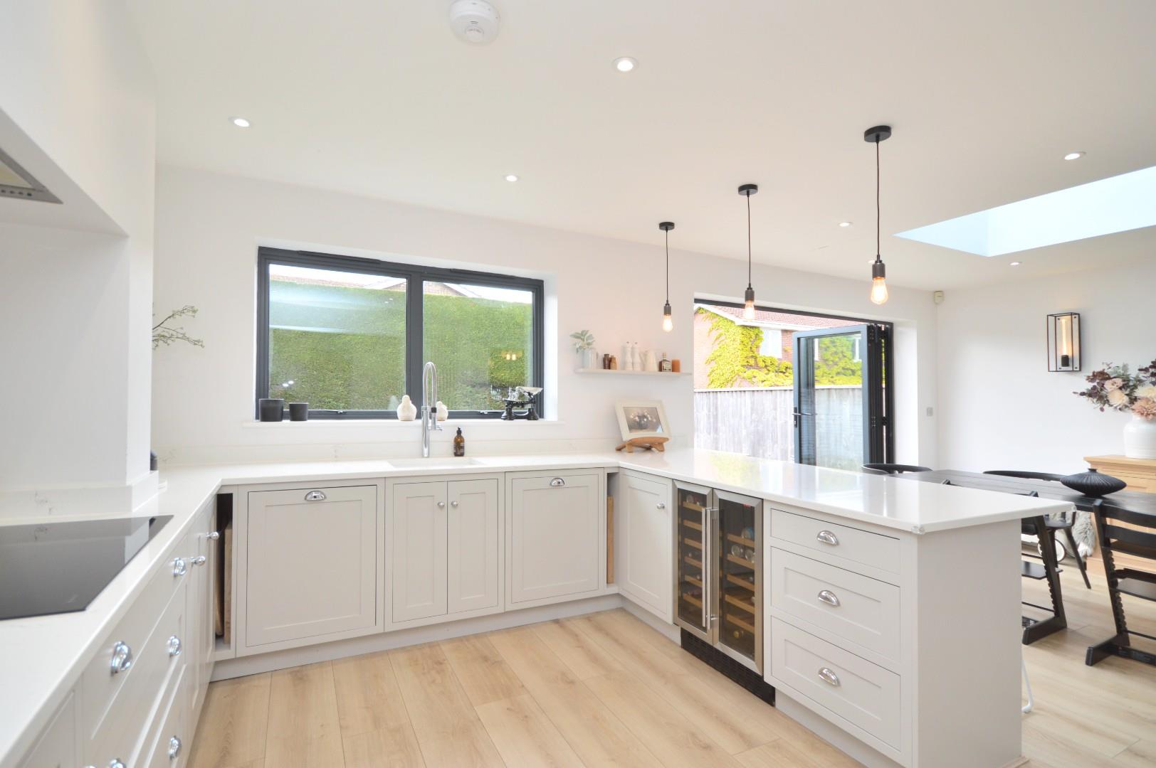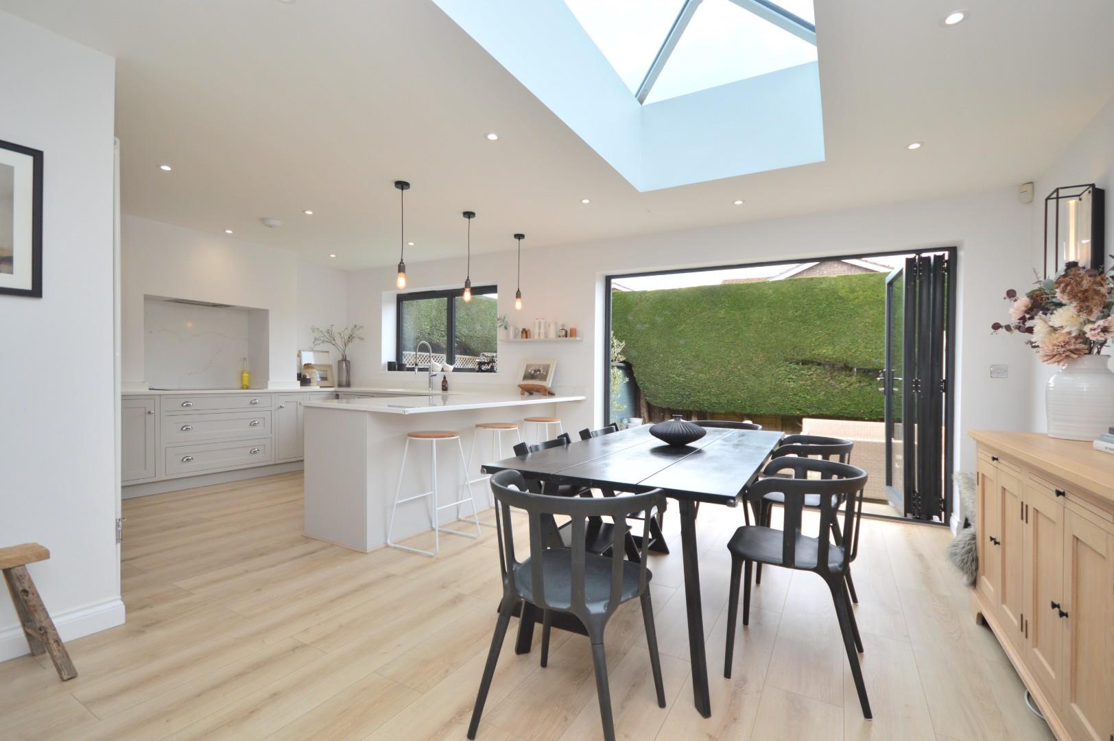 Lantern roof, anthracite grey aluminum coated bi folding doors leading to rear garden, anthracite grey aluminum window to rear aspect, wood effect flooring, inset spots, wall mounted period radiator, range of wall and base units with quartz work surface, breakfast bar, integrated double wine cooler, Neff integrated dishwasher, Villeroy and Bosch ceramic sink, tap over, integrated bin store, Neff induction hob, extractor fan over, quartz splash back, Smeg oven and grill, integrated fridge freezer, larder/coffee station, inset spotlights, door leading to utility room