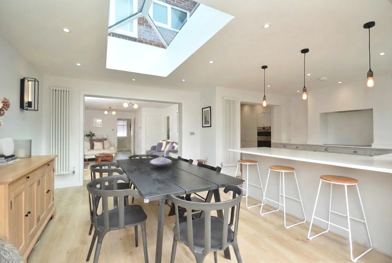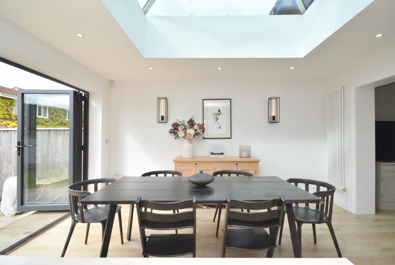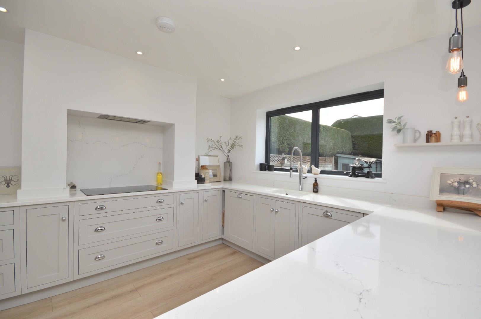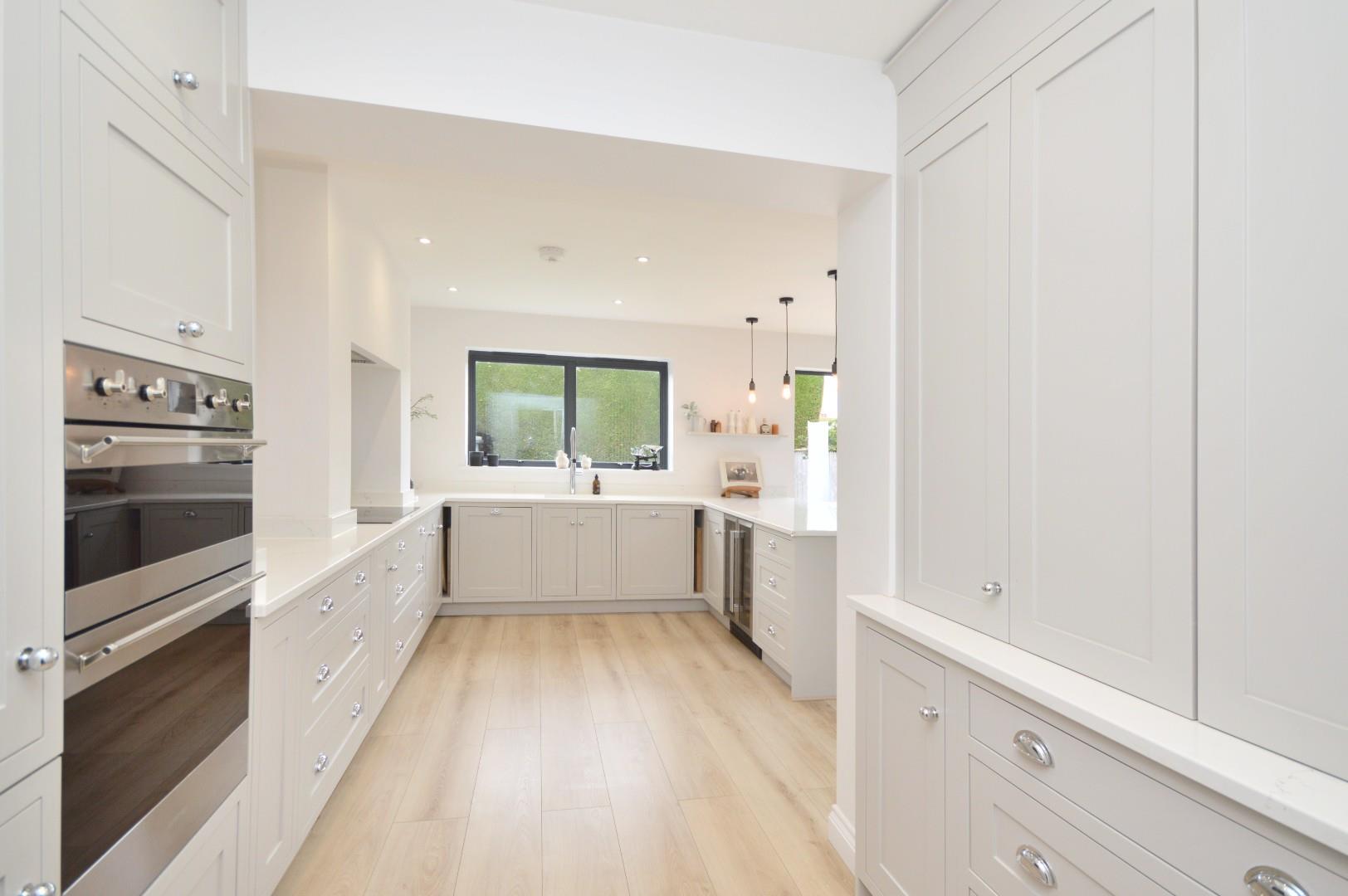 Lantern roof, anthracite grey aluminum coated bi folding doors leading to rear garden, anthracite grey aluminum window to rear aspect, wood effect flooring, inset spots, wall mounted period radiator, range of wall and base units with quartz work surface, breakfast bar, integrated double wine cooler, Neff integrated dishwasher, Villeroy and Bosch ceramic sink, tap over, integrated bin store, Neff induction hob, extractor fan over, quartz splash back, Smeg oven and grill, integrated fridge freezer, larder/coffee station, inset spotlights, door leading to utility room