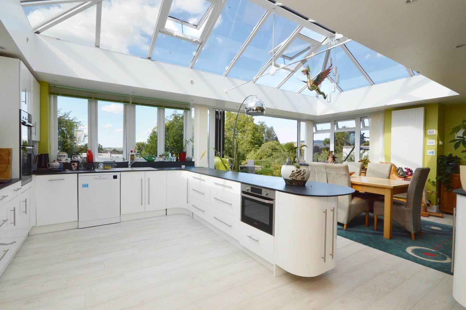 uPVC double glazed windows to rear aspect enjoying lovely views across the garden, bi-folding doors to raised decking area, glazed large lantern roof with lights and powered Velux opening, wood effect flooring, a range of wall and floor units with worksurface over, 1 1/2 bowl sink drainer unit with mixer taps, built in Neff oven and grill, electric hob with extractor hood with light over, space and plumbing for American style fridge freezer, integrated microwave, space and plumbing for full sized dishwasher, pan drawers, space for bar stools, door to